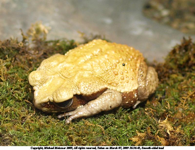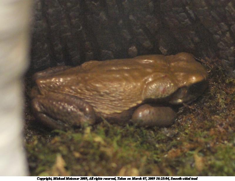 Picture #11: Smooth-sided toad 800x616, 79,380 bytes (78K), (html file) Copyright, Michael Meissner 2009, All rights reserved Olympus E-3 camera with Olympus 50mm f/2.0 lens f/2.0, ISO 1250, 1/50 sec, 50.0mm, auto mode, natural color, auto gradation, matrix metering, IS1 (All Direction Shake IS) 35mm equivalent focal length 100.0mm Extra equipment used: shot through glass Programs used: gimp Taken by Michael Meissner on March 07, 2009 16:25:04 Last modified on March 08, 2009 at 09:31 |