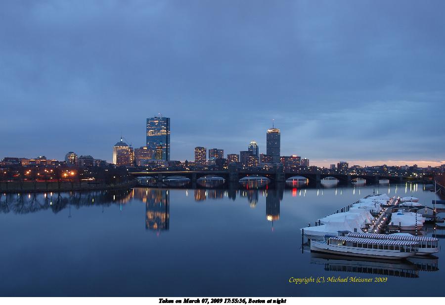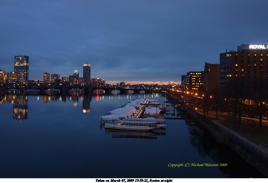 Picture #1: Boston at night 900x616, 77,279 bytes (76K), (html file) Olympus E-3 camera with Olympus 14-54mm f/2.8-3.5 lens f/5.6, ISO 100, 3.2 sec, 19.0mm, aperture priority, natural color, matrix metering, IS1 (All Direction Shake IS) 35mm equivalent focal length 38.0mm Extra equipment used: tripod, anti-shock Programs used: gimp Taken by Michael Meissner on March 07, 2009 17:55:36 Last modified on March 13, 2009 at 08:50 This picture is one of my favorites. |
