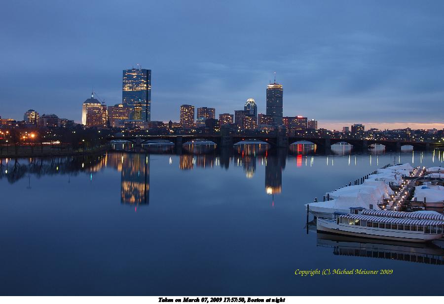 Picture #4: Boston at night #4 800x616, 76,557 bytes (75K), (html file) Olympus E-3 camera with Olympus 14-54mm f/2.8-3.5 lens f/5.6, ISO 100, 5 sec, 29.0mm, aperture priority, natural color, matrix metering, IS1 (All Direction Shake IS), noise reduction 35mm equivalent focal length 58.0mm Extra equipment used: tripod, anti-shock Programs used: gimp Taken by Michael Meissner on March 07, 2009 17:59:44 Last modified on March 13, 2009 at 21:53 This picture is one of my favorites. |