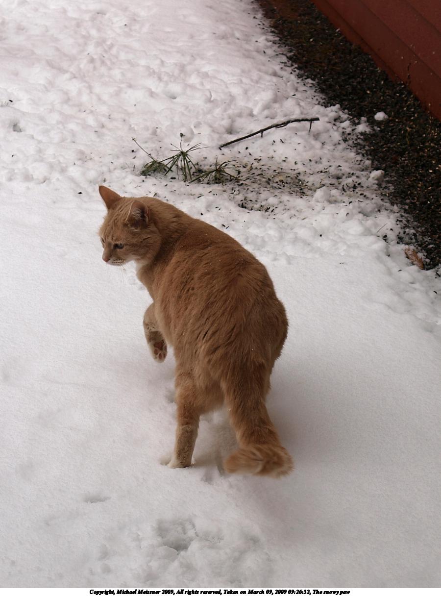 Picture #1: The snowy paw 900x1216, 145,580 bytes (143K), (html file) Copyright, Michael Meissner 2009, All rights reserved Olympus E-3 camera with Olympus 14-54mm f/2.8-3.5 lens f/3.5, ISO 100, 1/100 sec, 32.0mm, auto mode, natural color, matrix metering, IS1 (All Direction Shake IS) 35mm equivalent focal length 64.0mm Programs used: gimp Taken by Michael Meissner on March 09, 2009 09:26:32 Last modified on March 09, 2009 at 22:29 |
