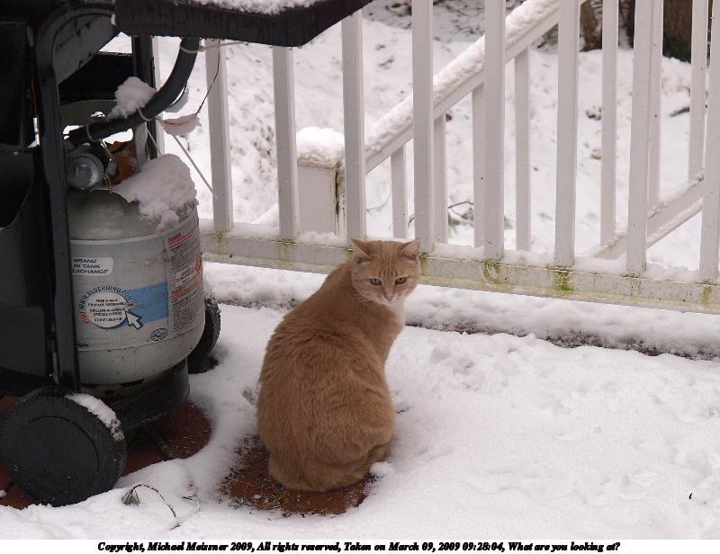 Picture #2: What are you looking at? 800x616, 93,943 bytes (92K), (html file) Copyright, Michael Meissner 2009, All rights reserved Olympus E-3 camera with Olympus 14-54mm f/2.8-3.5 lens f/5.6, ISO 200, 1/100 sec, 45.0mm, aperture priority, natural color, matrix metering, IS1 (All Direction Shake IS) 35mm equivalent focal length 90.0mm Programs used: gimp Taken by Michael Meissner on March 09, 2009 09:28:04 Last modified on March 09, 2009 at 22:36 |