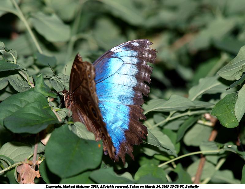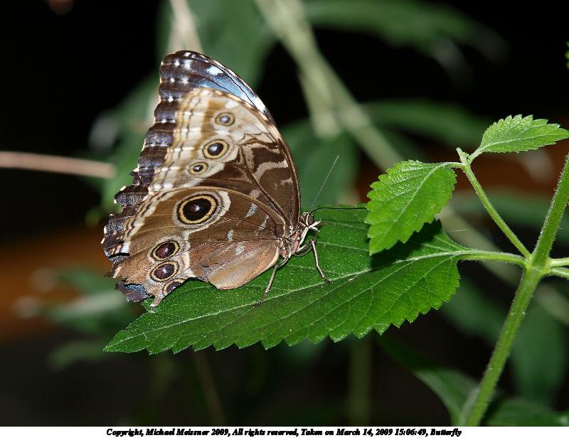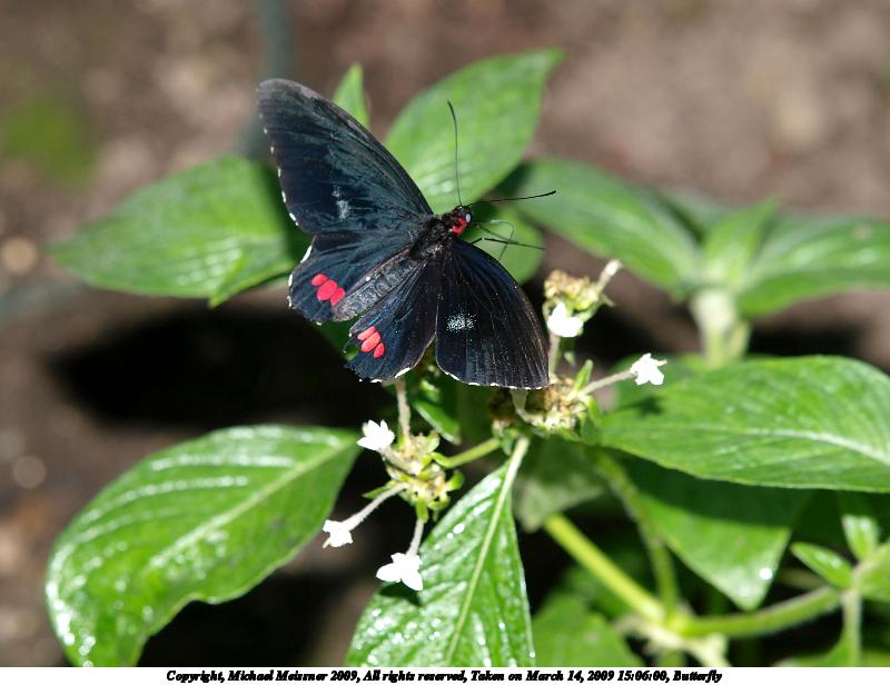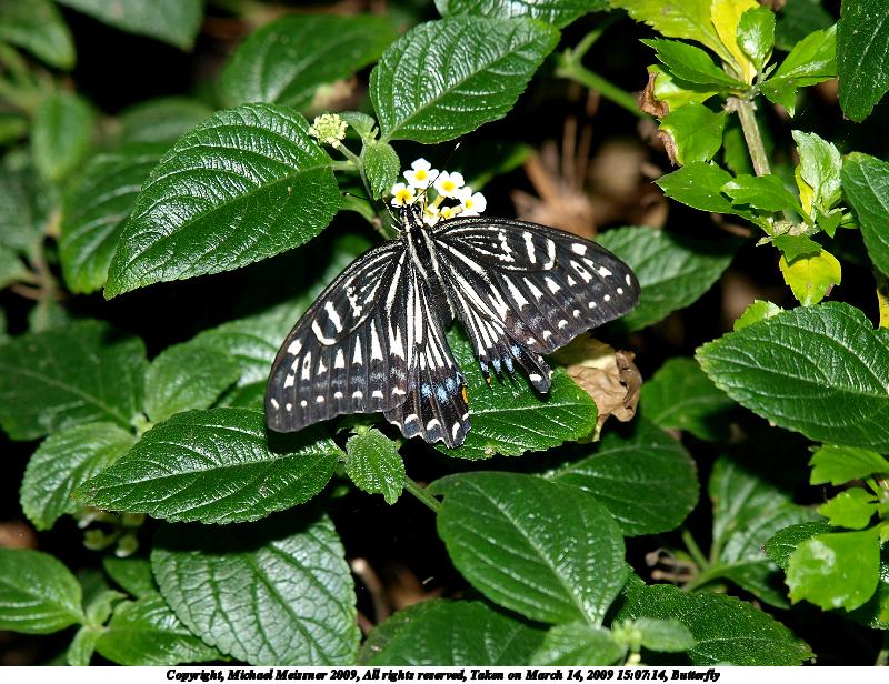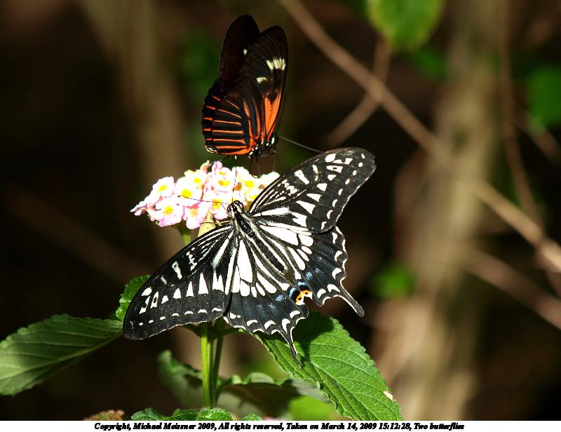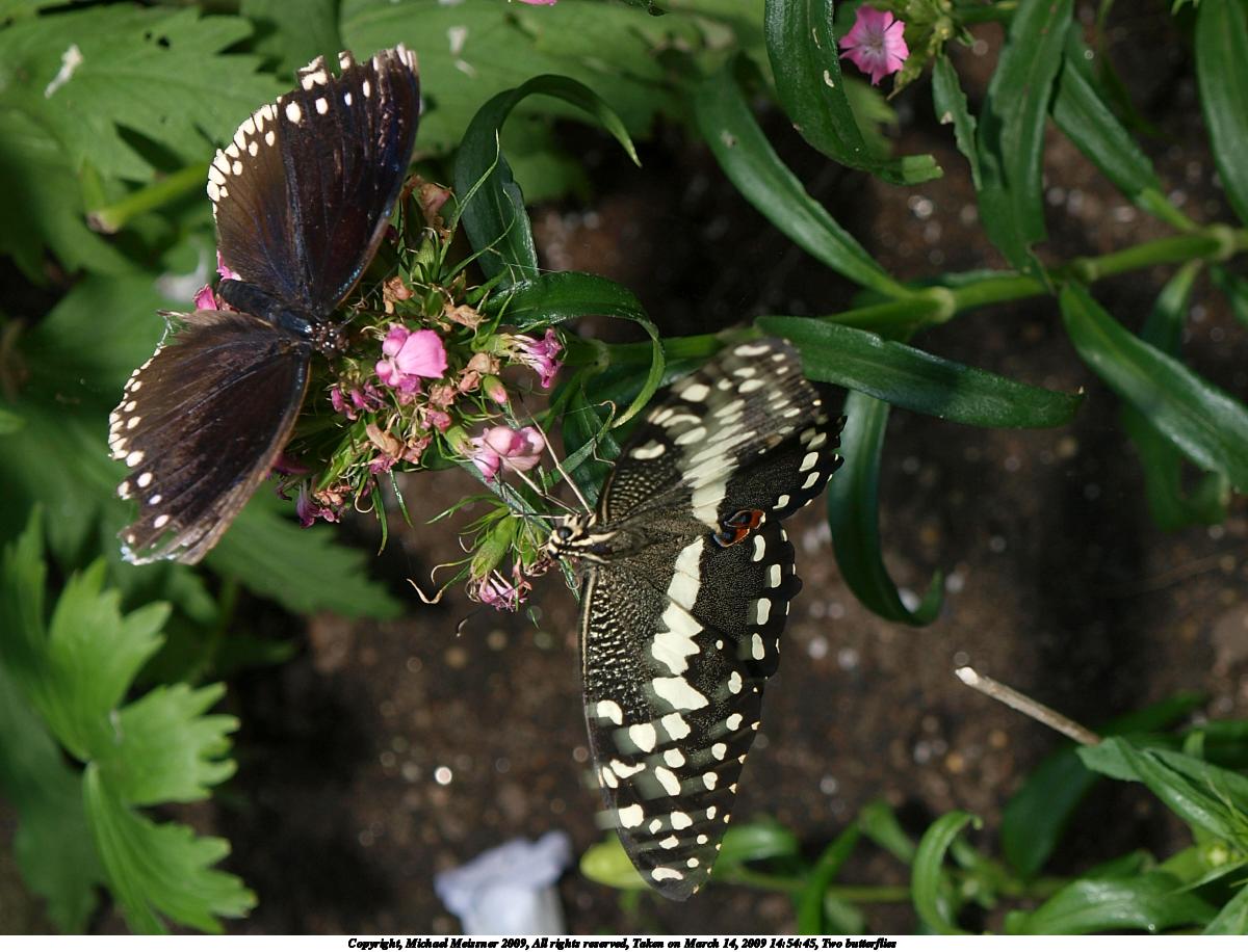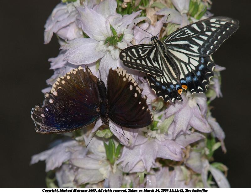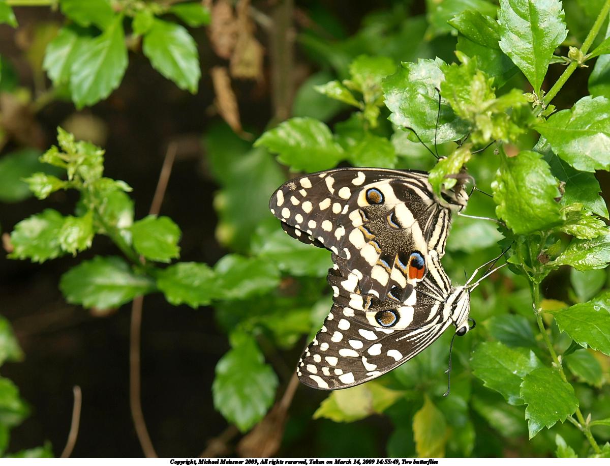 Picture #3: Two butterflies #2 1200x916, 178,325 bytes (175K), (html file) Copyright, Michael Meissner 2009, All rights reserved Olympus E-3 camera with Olympus 14-54mm f/2.8-3.5 lens f/5.6, ISO 100, FL-50 flash (-0.3 flash compensation), 1/100 sec, 48.0mm, aperture priority, natural color, matrix metering, IS1 (All Direction Shake IS) 35mm equivalent focal length 96.0mm Extra equipment used: FL-50 flash Programs used: gimp Taken by Michael Meissner on March 14, 2009 14:55:49 Last modified on March 14, 2009 at 23:55 |