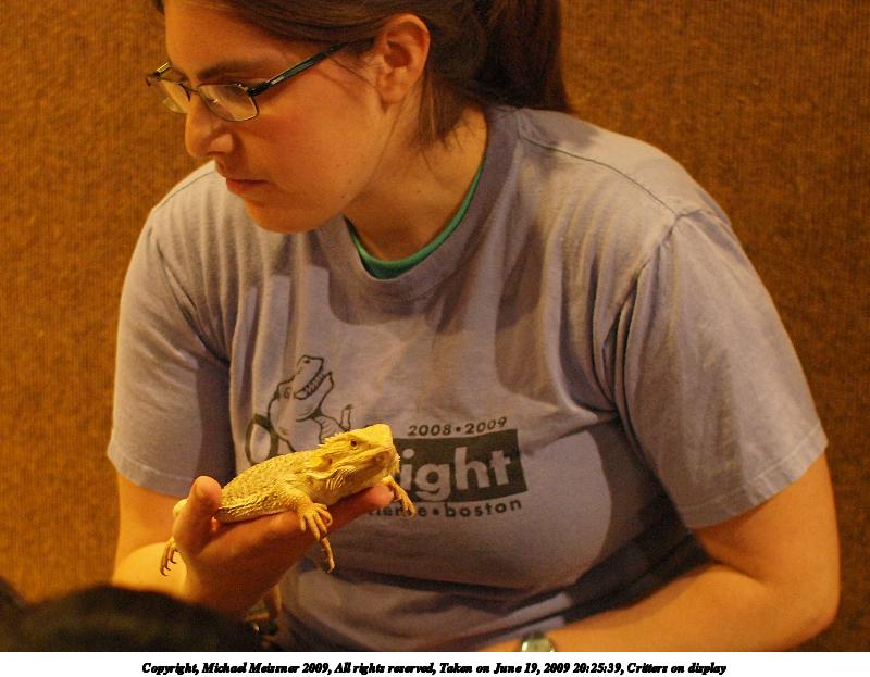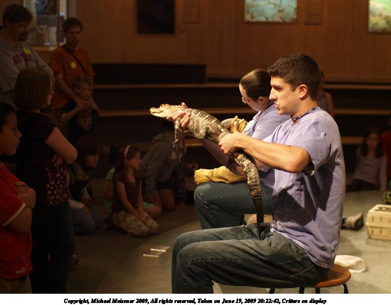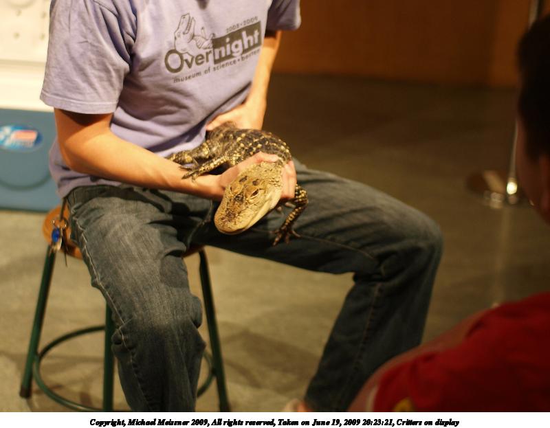 Picture #24: Critters on display #5 800x623, 93,266 bytes (92K), (html file) Copyright, Michael Meissner 2009, All rights reserved Olympus E-3 camera with Sigma 30mm f/1.4 lens f/2.0, ISO 1250, 1/30 sec, 30.0mm, aperture priority, natural color, matrix metering, IS1 (All Direction Shake IS), noise filter low 35mm equivalent focal length 60.0mm Programs used: gimp Taken by Michael Meissner on June 19, 2009 20:25:39 Last modified on June 24, 2009 at 09:01 |