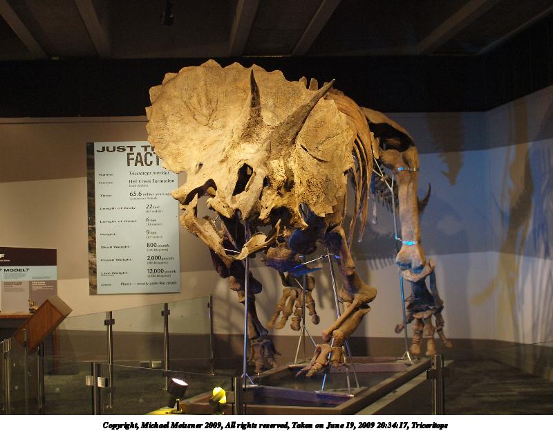 Picture #17: Triceratops 800x623, 119,906 bytes (118K), (html file) Copyright, Michael Meissner 2009, All rights reserved Olympus E-3 camera with Sigma 30mm f/1.4 lens f/2.0, ISO 1000, 1/80 sec, 30.0mm, aperture priority, natural color, matrix metering, IS1 (All Direction Shake IS), noise filter low 35mm equivalent focal length 60.0mm Programs used: gimp Taken by Michael Meissner on June 19, 2009 20:34:35 Last modified on July 03, 2009 at 19:12 |