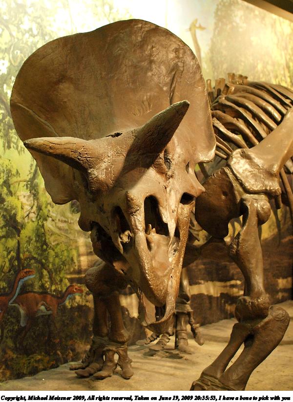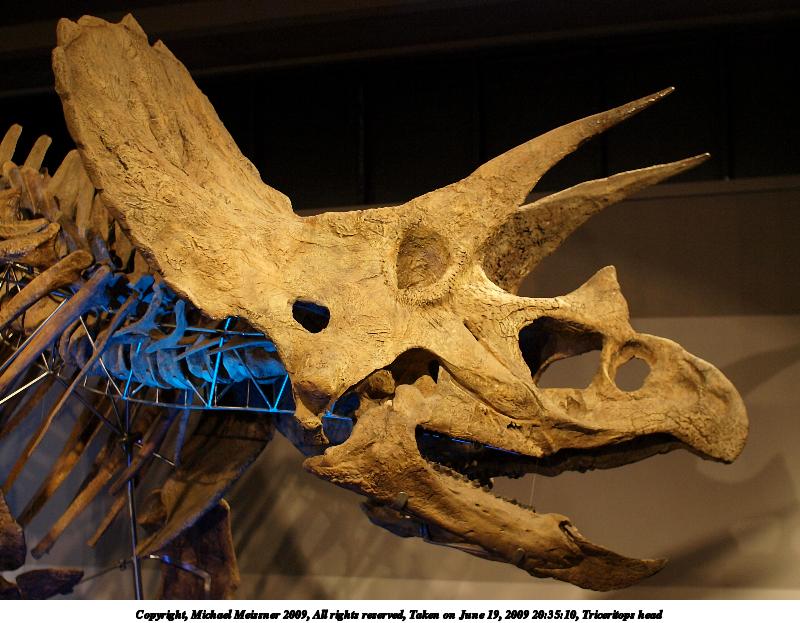 Picture #15: Triceritops head 800x623, 107,526 bytes (106K), (html file) Copyright, Michael Meissner 2009, All rights reserved Olympus E-3 camera with Sigma 30mm f/1.4 lens f/2.0, ISO 800, 1/80 sec, 30.0mm, aperture priority, natural color, matrix metering, IS1 (All Direction Shake IS), noise filter low 35mm equivalent focal length 60.0mm Programs used: gimp Taken by Michael Meissner on June 19, 2009 20:35:10 Last modified on July 03, 2009 at 19:18 |