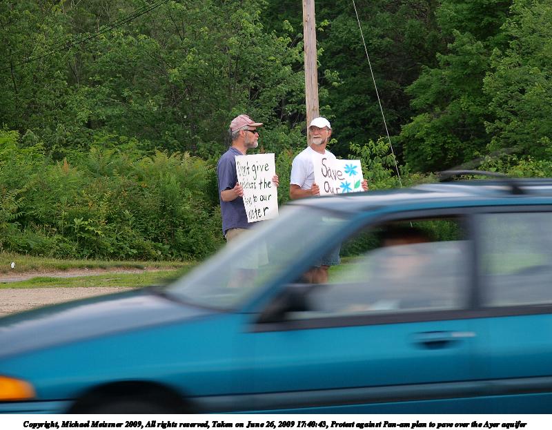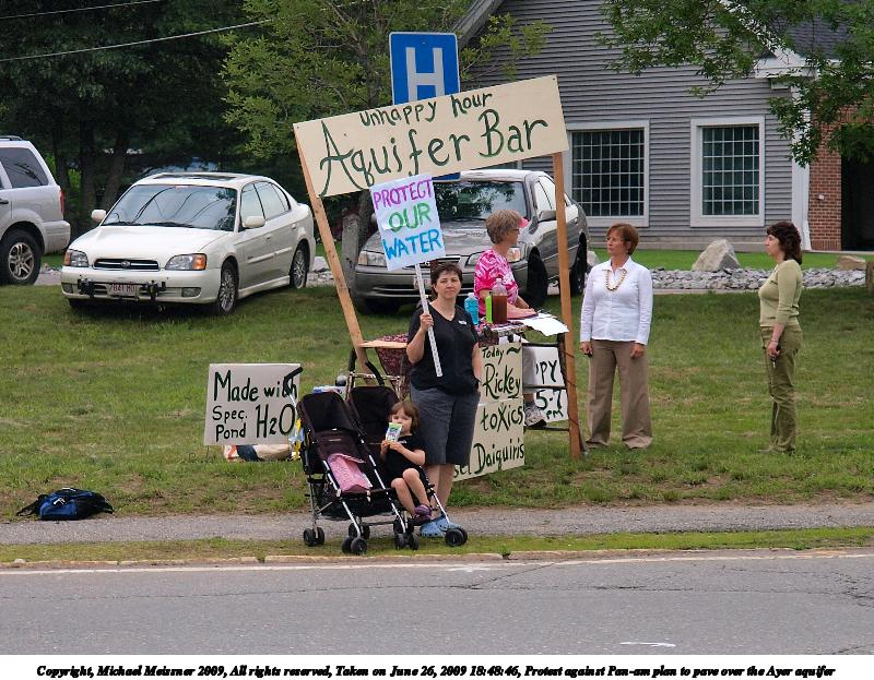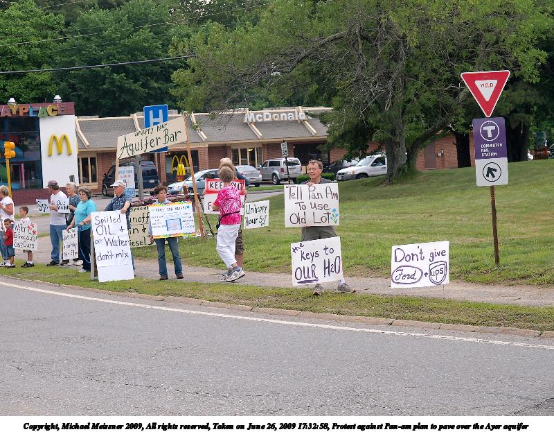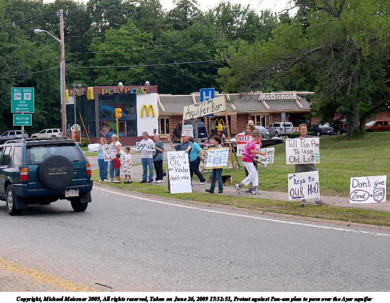 Picture #3: Protest against Pan-am plan to pave over the Ayer aquifer #9 600x846, 132,277 bytes (130K), (html file) Copyright, Michael Meissner 2009, All rights reserved Olympus E-3 camera with Olympus 14-54mm f/2.8-3.5 lens f/3.3, ISO 100, 1/80 sec, 38.0mm, auto mode, vivid color, auto gradation, matrix metering, auto + manual focus, IS1 (All Direction Shake IS), noise filter low 35mm equivalent focal length 76.0mm Programs used: gimp Taken by Michael Meissner on June 26, 2009 17:59:13 Last modified on July 06, 2009 at 00:12 |