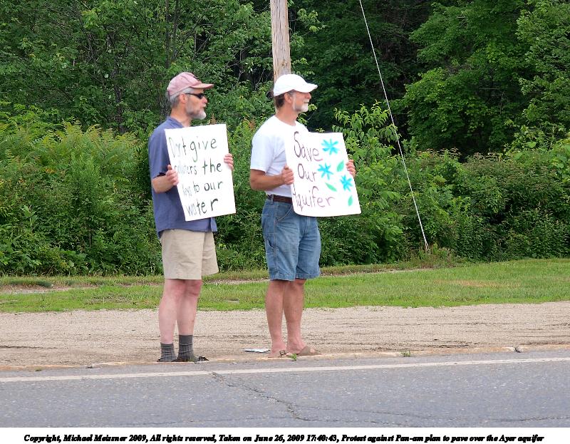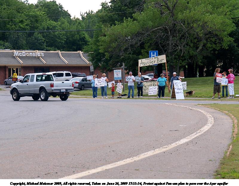 Picture #4: Protest against Pan-am plan to pave over the Ayer aquifer #8 800x623, 140,004 bytes (137K), (html file) Copyright, Michael Meissner 2009, All rights reserved Olympus E-3 camera with Olympus 14-54mm f/2.8-3.5 lens f/3.5, ISO 200, 1/100 sec, 54.0mm, auto mode, vivid color, auto gradation, matrix metering, auto + manual focus, IS1 (All Direction Shake IS), noise filter low 35mm equivalent focal length 108.0mm Programs used: gimp Taken by Michael Meissner on June 26, 2009 17:42:33 Last modified on July 06, 2009 at 00:09 |