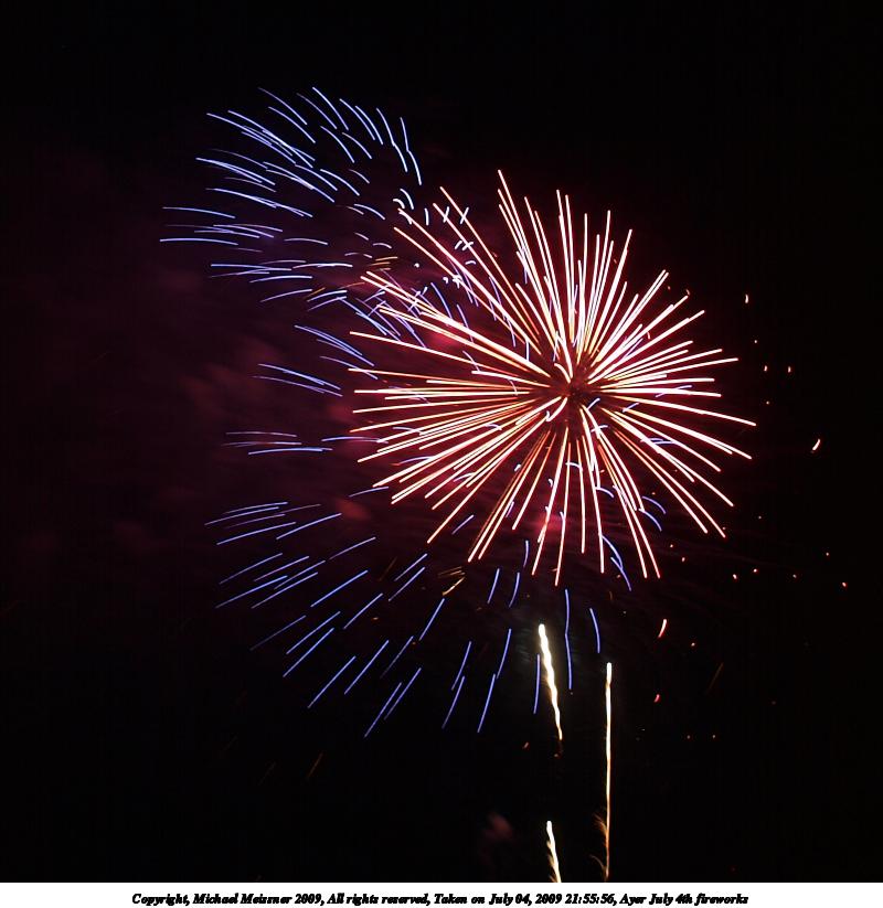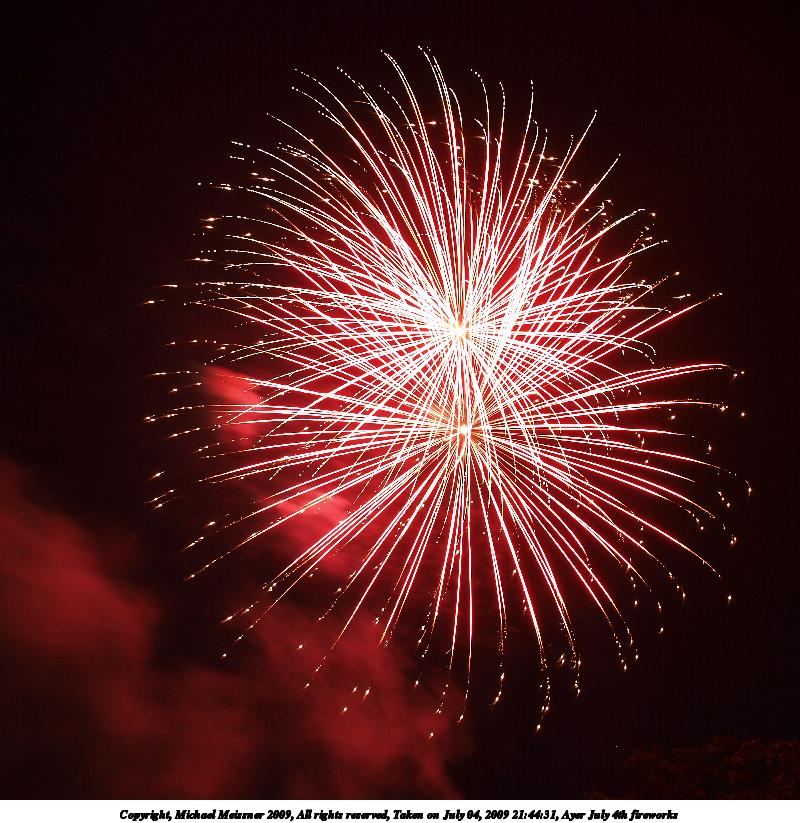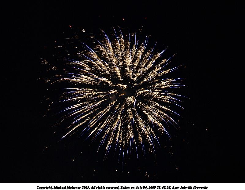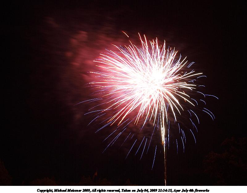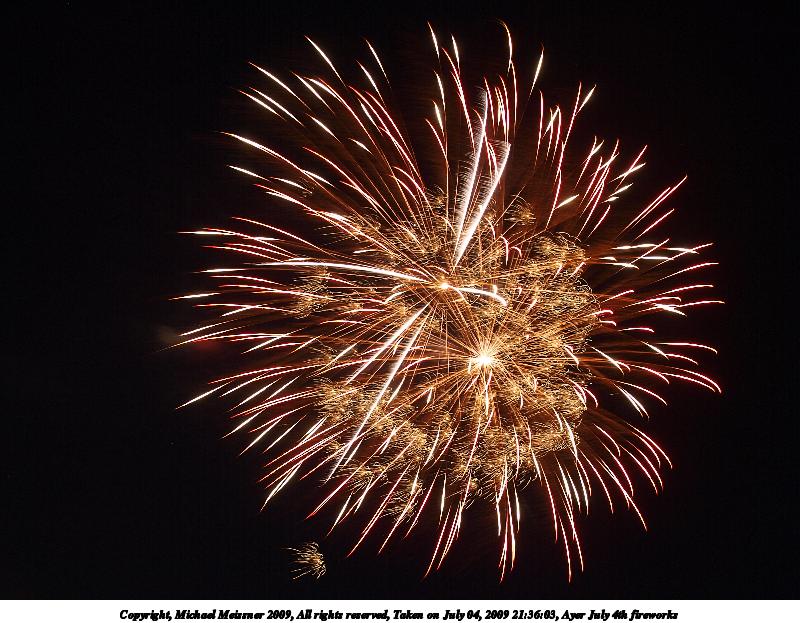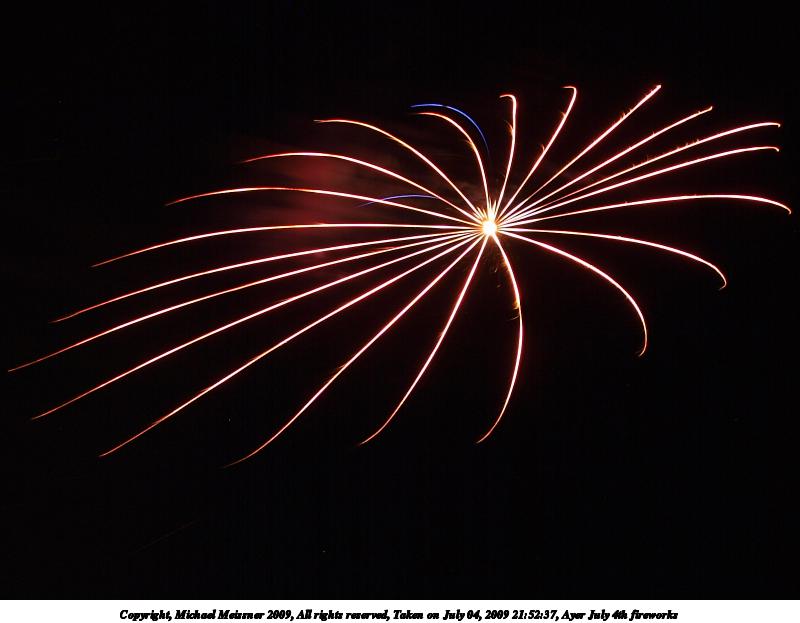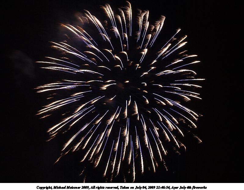 Picture #69: Ayer July 4th fireworks 800x623, 70,089 bytes (69K), (html file) Copyright, Michael Meissner 2009, All rights reserved Olympus E-3 camera with Olympus 14-54mm f/2.8-3.5 lens f/5.0, ISO 100, 1.2 sec, 14.0mm, bulb mode, natural color, matrix metering, noise filter low 35mm equivalent focal length 28.0mm Extra equipment used: tripod, radio shutter release Programs used: gimp Taken by Michael Meissner on July 04, 2009 21:34:15 Last modified on July 06, 2009 at 00:17 |