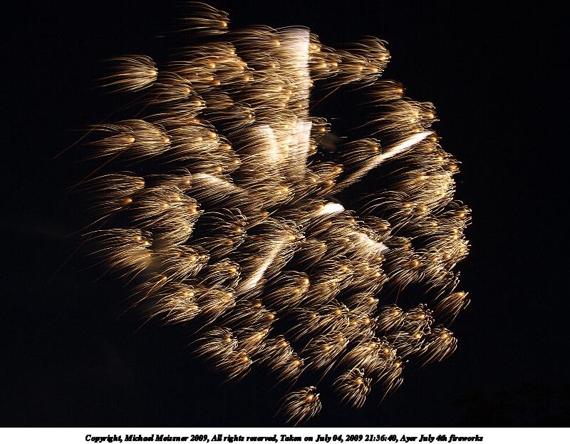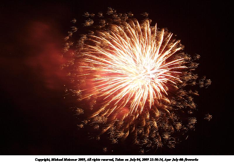 Picture #63: Ayer July 4th fireworks #7 800x823, 140,709 bytes (138K), (html file) Copyright, Michael Meissner 2009, All rights reserved Olympus E-3 camera with Olympus 14-54mm f/2.8-3.5 lens f/5.0, ISO 100, 3.4 sec, 14.0mm, bulb mode, natural color, matrix metering, noise filter low 35mm equivalent focal length 28.0mm Extra equipment used: tripod, radio shutter release Programs used: gimp Taken by Michael Meissner on July 04, 2009 21:44:31 Last modified on July 06, 2009 at 00:29 |