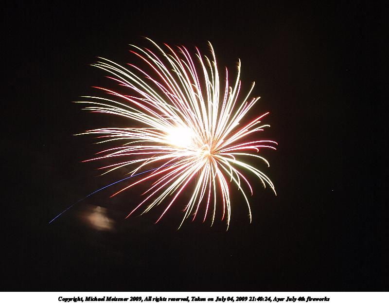 Picture #59: Ayer July 4th fireworks #11 800x623, 101,766 bytes (100K), (html file) Copyright, Michael Meissner 2009, All rights reserved Olympus E-3 camera with Olympus 14-54mm f/2.8-3.5 lens f/5.0, ISO 100, 1.8 sec, 14.0mm, bulb mode, natural color, matrix metering, noise filter low 35mm equivalent focal length 28.0mm Extra equipment used: tripod, radio shutter release Programs used: gimp Taken by Michael Meissner on July 04, 2009 21:48:19 Last modified on July 06, 2009 at 00:35 |