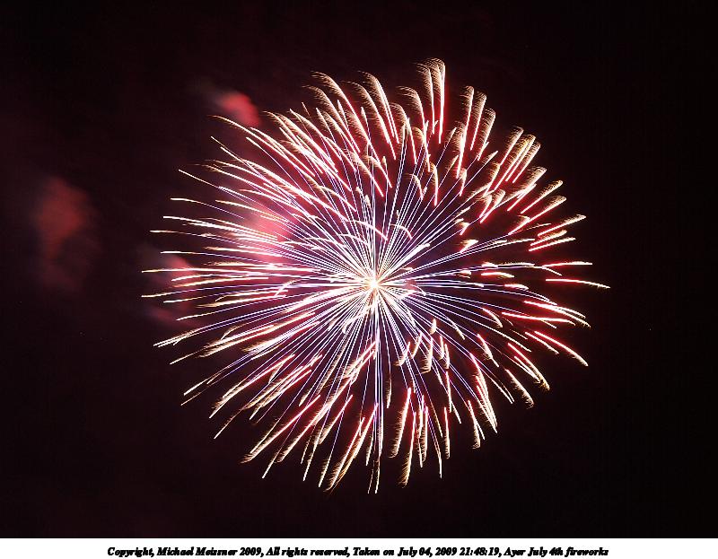 Picture #60: Ayer July 4th fireworks #10 800x823, 113,385 bytes (111K), (html file) Copyright, Michael Meissner 2009, All rights reserved Olympus E-3 camera with Olympus 14-54mm f/2.8-3.5 lens f/5.0, ISO 100, 2.2 sec, 14.0mm, bulb mode, natural color, matrix metering, noise filter low 35mm equivalent focal length 28.0mm Extra equipment used: tripod, radio shutter release Programs used: gimp Taken by Michael Meissner on July 04, 2009 21:48:10 Last modified on July 06, 2009 at 00:34 This picture is one of my favorites. |
