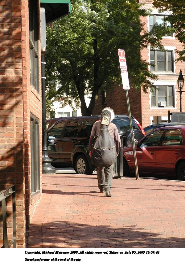 Picture #43: Street performer at the end of the gig 600x846, 130,198 bytes (128K), (html file) Copyright, Michael Meissner 2009, All rights reserved Olympus C-2100UZ camera f/3.5, ISO 100, 1/650 sec, 27.3mm, auto mode, SHQ, cloudy, matrix metering 35mm equivalent focal length 151.0mm Taken by Michael Meissner on July 05, 2009 16:59:42 Last modified on July 06, 2009 at 08:17 |