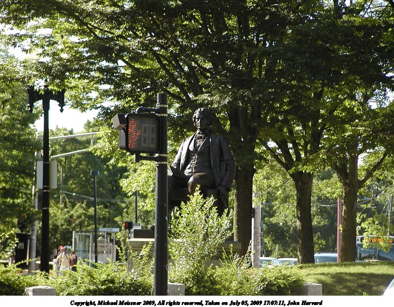 Picture #39: John Harvard #2 800x623, 166,494 bytes (163K), (html file) Copyright, Michael Meissner 2009, All rights reserved Olympus C-2100UZ camera f/2.8, ISO 100, 1/400 sec, 31.1mm, auto mode, SHQ, cloudy, matrix metering 35mm equivalent focal length 173.0mm Taken by Michael Meissner on July 05, 2009 17:07:11 Last modified on July 06, 2009 at 08:18 |