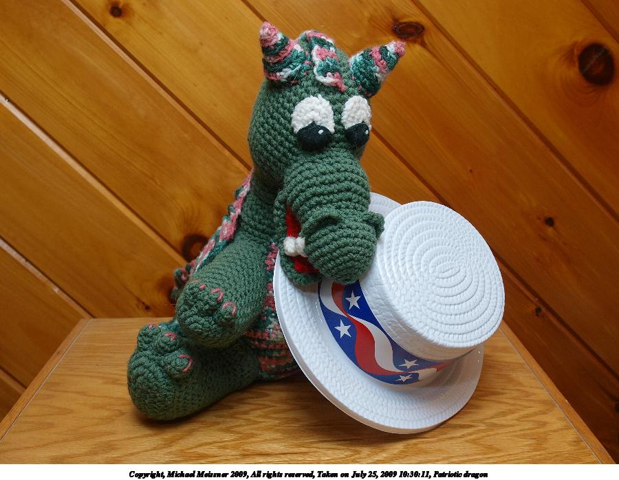 Picture #36: Patriotic dragon 900x698, 110,171 bytes (108K), (html file) Copyright, Michael Meissner 2009, All rights reserved Olympus E-3 camera with Olympus 14-54mm f/2.8-3.5 lens f/5.6, ISO 200, FL-50 flash, 1/60 sec, 20.0mm, aperture priority, vivid color, SHQ, matrix metering, IS1 (All Direction Shake IS), noise filter low 35mm equivalent focal length 40.0mm Extra equipment used: FL-50 flash, Flip-it Programs used: gimp Taken by Michael Meissner on July 25, 2009 10:30:11 Last modified on July 25, 2009 at 13:00 |