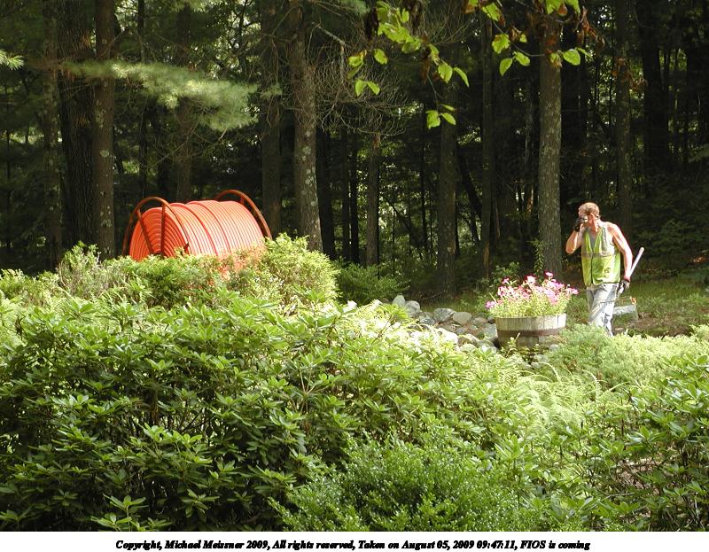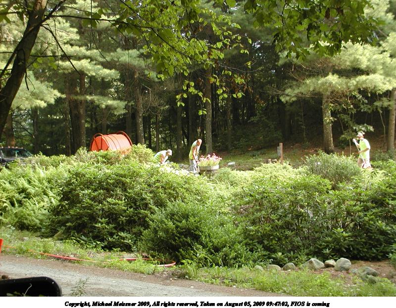 Picture #3: FIOS is coming 800x623, 152,050 bytes (149K), (html file) Copyright, Michael Meissner 2009, All rights reserved Olympus C-2100UZ camera f/2.8, ISO 100, 1/125 sec, 11.6mm, auto mode, SHQ, cloudy, matrix metering 35mm equivalent focal length 64.0mm Taken by Michael Meissner on August 05, 2009 09:47:02 Last modified on August 05, 2009 at 14:26 Shutter speed of 1/125 or 1/250 may indicate use of flash |
