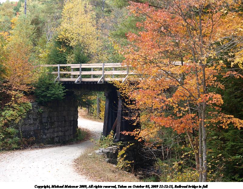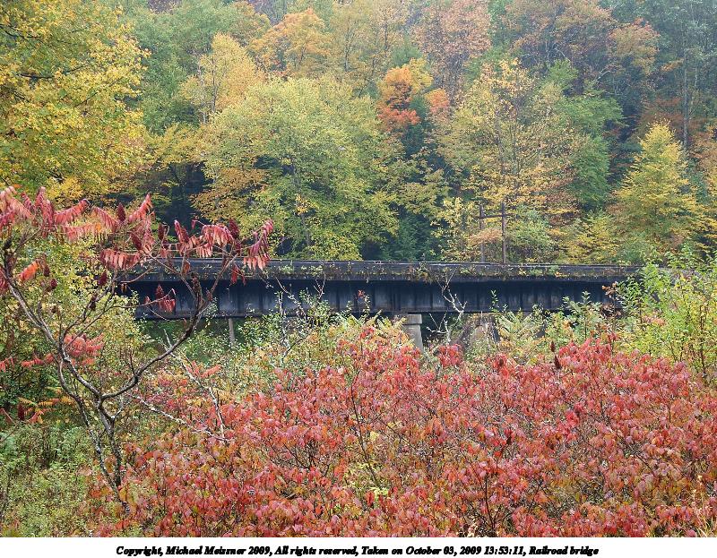Picture #31: Railroad bridge in fall 800x623, 201,269 bytes (197K), (html file) Copyright, Michael Meissner 2009, All rights reserved Olympus E-3 camera with Olympus 14-54mm f/2.8-3.5 lens f/3.5, ISO 100, 1/100 sec, 40.0mm, auto mode, natural color, SHQ, matrix metering, IS1 (All Direction Shake IS), noise filter low 35mm equivalent focal length 80.0mm Programs used: gimp Taken by Michael Meissner on October 05, 2009 11:12:15 Last modified on October 07, 2009 at 23:10 |