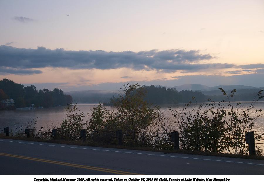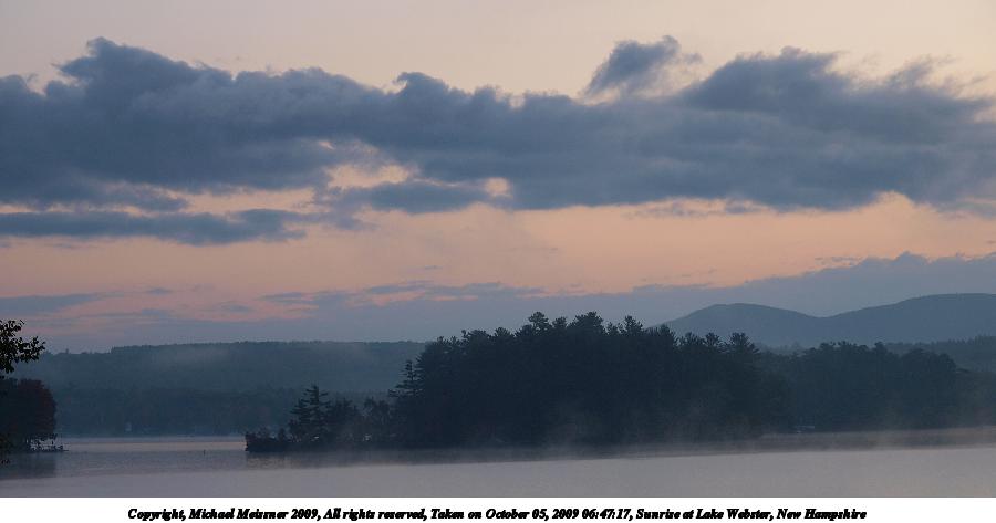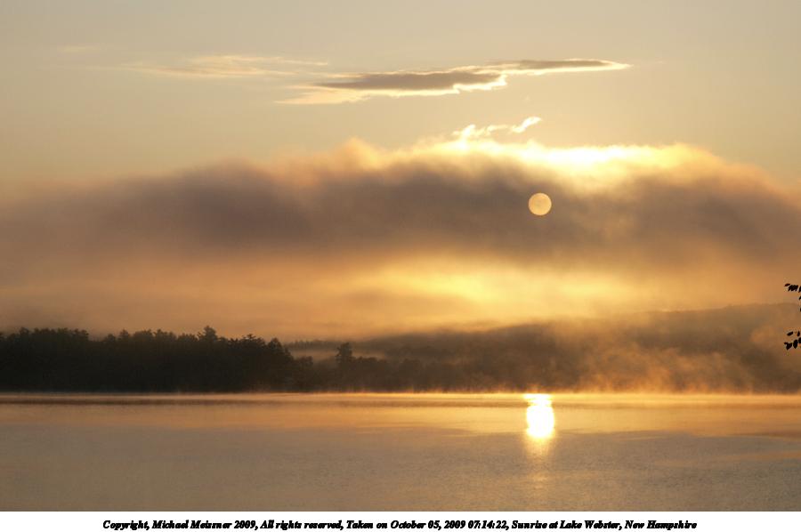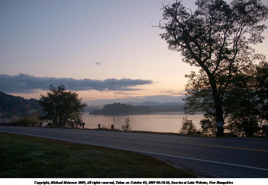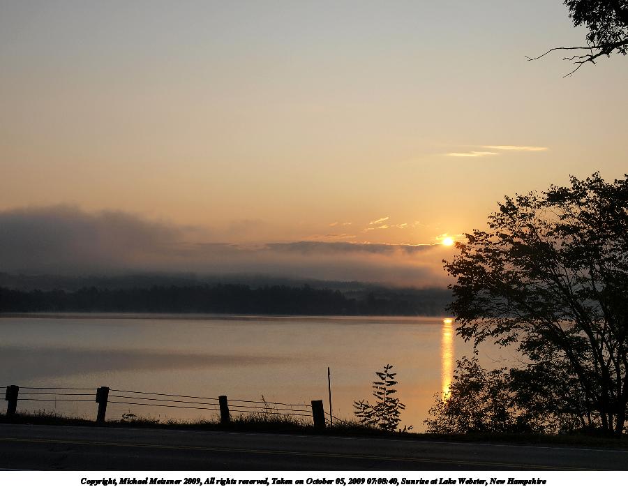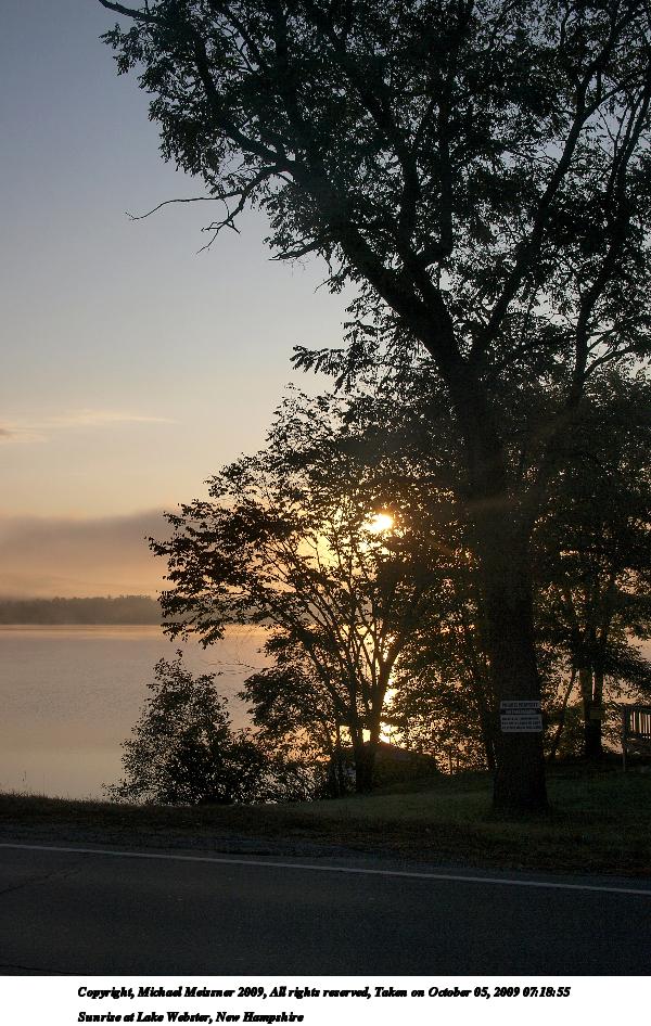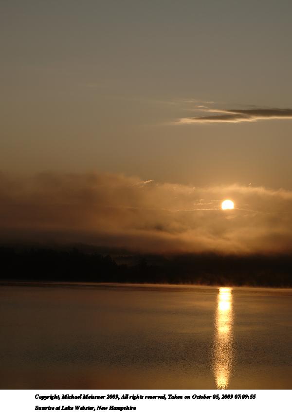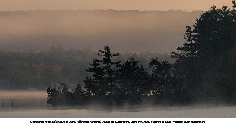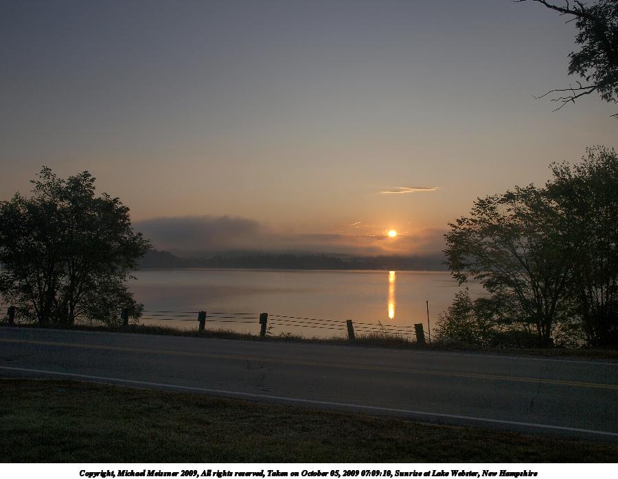 Picture #8: Sunrise at Lake Webster, New Hampshire #8 900x698, 60,582 bytes (60K), (html file) Copyright, Michael Meissner 2009, All rights reserved Olympus E-3 camera with Olympus 14-54mm f/2.8-3.5 lens f/8.0, ISO 100, 1/640 sec, 47.0mm, auto mode, natural color, auto gradation, SHQ, spot metering, IS1 (All Direction Shake IS), noise filter low, exposure bracketing (shot 1) 35mm equivalent focal length 94.0mm Programs used: gimp Taken by Michael Meissner on October 05, 2009 07:10:26 Last modified on October 06, 2009 at 07:33 This picture is one of my favorites. |