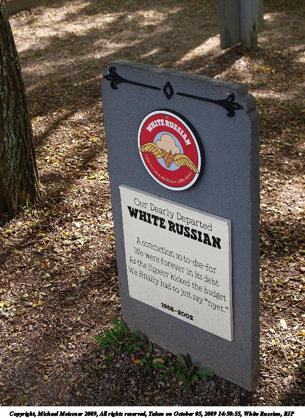 Picture #5: White Russian, RIP 600x823, 171,054 bytes (168K), (html file) Copyright, Michael Meissner 2009, All rights reserved Olympus E-3 camera with Olympus 14-54mm f/2.8-3.5 lens f/4.5, ISO 100, 1/125 sec, 29.0mm, auto mode, natural color, SHQ, matrix metering, IS1 (All Direction Shake IS), noise filter low 35mm equivalent focal length 58.0mm Programs used: gimp Taken by Michael Meissner on October 05, 2009 14:50:55 Last modified on October 07, 2009 at 23:48 |
