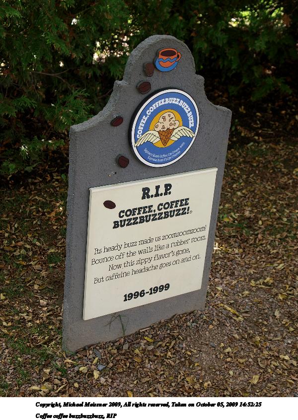 Picture #7: Coffee coffee buzzbuzzbuzz, RIP 600x846, 142,805 bytes (140K), (html file) Copyright, Michael Meissner 2009, All rights reserved Olympus E-3 camera with Olympus 14-54mm f/2.8-3.5 lens f/3.5, ISO 100, 1/100 sec, 28.0mm, auto mode, natural color, SHQ, matrix metering, IS1 (All Direction Shake IS), noise filter low 35mm equivalent focal length 56.0mm Programs used: gimp Taken by Michael Meissner on October 05, 2009 14:52:25 Last modified on October 07, 2009 at 23:52 |