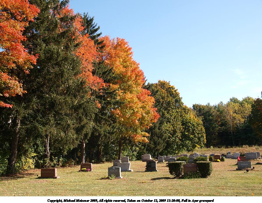 Picture #62: Fall in Ayer graveyard 900x698, 209,505 bytes (205K), (html file) Copyright, Michael Meissner 2009, All rights reserved Olympus E-3 camera with Olympus 14-54mm f/2.8-3.5 lens f/5.0, ISO 100, 1/250 sec, 22.0mm, auto mode, natural color, SHQ, center weight metering, IS1 (All Direction Shake IS), noise filter low 35mm equivalent focal length 44.0mm Programs used: gimp Taken by Michael Meissner on October 12, 2009 11:20:08 Last modified on October 13, 2009 at 09:10 |