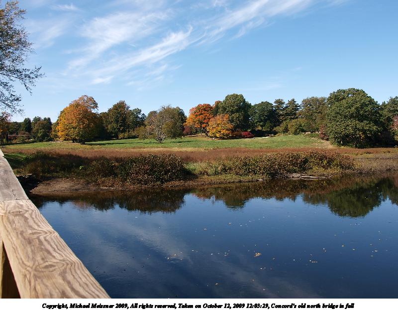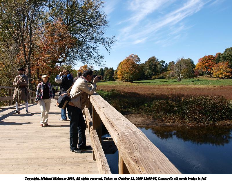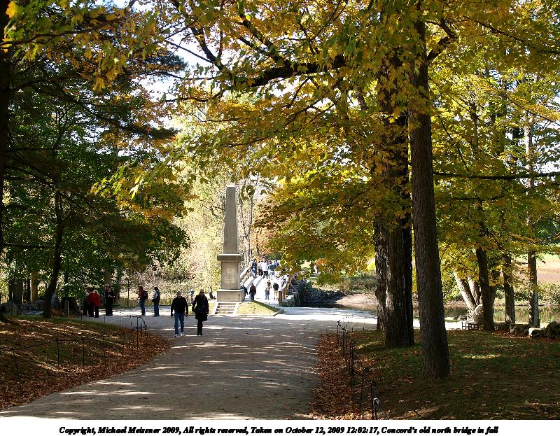 Picture #68: Concord's old north bridge in fall 800x623, 212,428 bytes (208K), (html file) Copyright, Michael Meissner 2009, All rights reserved Olympus E-3 camera with Olympus 14-54mm f/2.8-3.5 lens f/4.0, ISO 100, 1/125 sec, 25.0mm, auto mode, natural color, SHQ, matrix metering, IS1 (All Direction Shake IS), noise filter low 35mm equivalent focal length 50.0mm Programs used: gimp Taken by Michael Meissner on October 12, 2009 12:02:17 Last modified on October 14, 2009 at 08:15 |