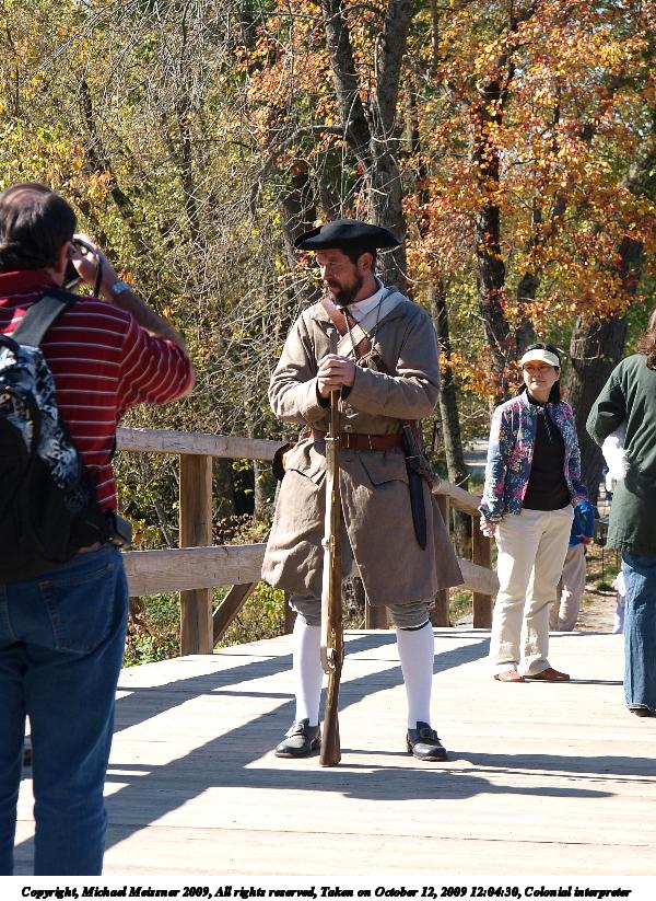 Picture #71: Colonial interpreter 600x823, 167,995 bytes (165K), (html file) Copyright, Michael Meissner 2009, All rights reserved Olympus E-3 camera with Olympus 14-54mm f/2.8-3.5 lens f/5.0, ISO 100, 1/200 sec, 47.0mm, auto mode, natural color, SHQ, matrix metering, IS1 (All Direction Shake IS), noise filter low 35mm equivalent focal length 94.0mm Programs used: gimp Taken by Michael Meissner on October 12, 2009 12:04:30 Last modified on October 14, 2009 at 08:20 |
