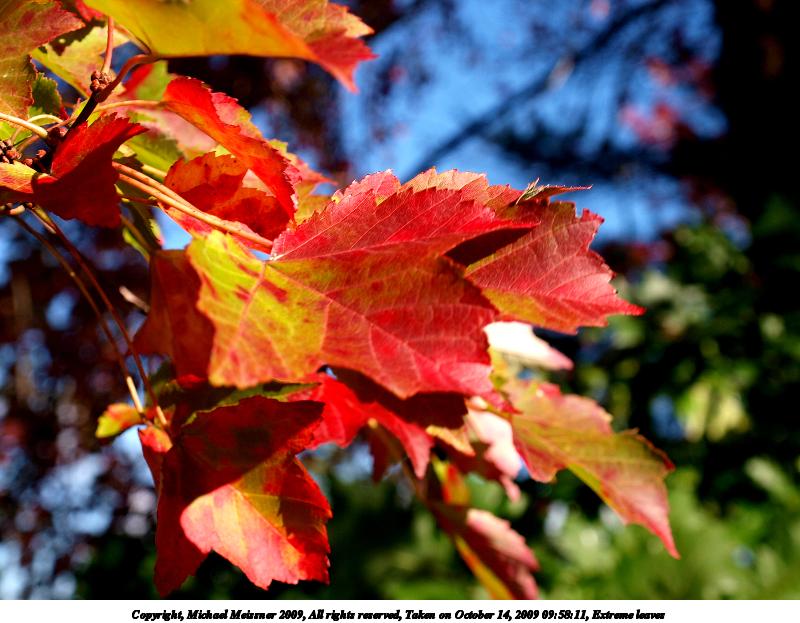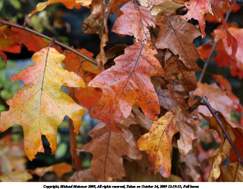 Picture #89: Extreme leaves 800x623, 90,153 bytes (89K), (html file) Copyright, Michael Meissner 2009, All rights reserved Olympus E-3 camera with Olympus 14-54mm f/2.8-3.5 lens f/5.6, ISO 100, 1/250 sec, 32.0mm, auto mode, natural color, SHQ, matrix metering, IS1 (All Direction Shake IS), noise filter low 35mm equivalent focal length 64.0mm Programs used: gimp Taken by Michael Meissner on October 14, 2009 09:58:11 Last modified on October 14, 2009 at 21:41 |