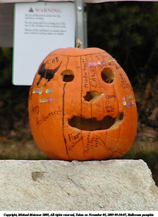 Picture #31: Halloween pumpkin 600x823, 71,648 bytes (70K), (html file) Copyright, Michael Meissner 2009, All rights reserved Olympus C-2100UZ camera f/3.5, ISO 100, 1/250 sec, 70.0mm, auto mode, SHQ, cloudy, matrix metering 35mm equivalent focal length 388.0mm Programs used: gimp Taken by Michael Meissner on November 05, 2009 09:30:07 Last modified on November 08, 2009 at 19:17 Shutter speed of 1/125 or 1/250 may indicate use of flash |