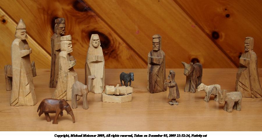 Picture #2: Nativity set 900x473, 70,902 bytes (70K), (html file) Copyright, Michael Meissner 2009, All rights reserved Olympus E-P2 camera with Olympus-m43 14-42mm f/3.5-5.6 lens f/4.1, ISO 200, FL-36 flash, 1/60 sec, 20.0mm, auto mode, natural color, matrix metering, IS1 (All Direction Shake IS), noise reduction auto 35mm equivalent focal length 40.0mm Extra equipment used: FL-36 flash Programs used: gimp Taken by Michael Meissner on December 05, 2009 21:52:24 Last modified on December 06, 2009 at 09:37 |
