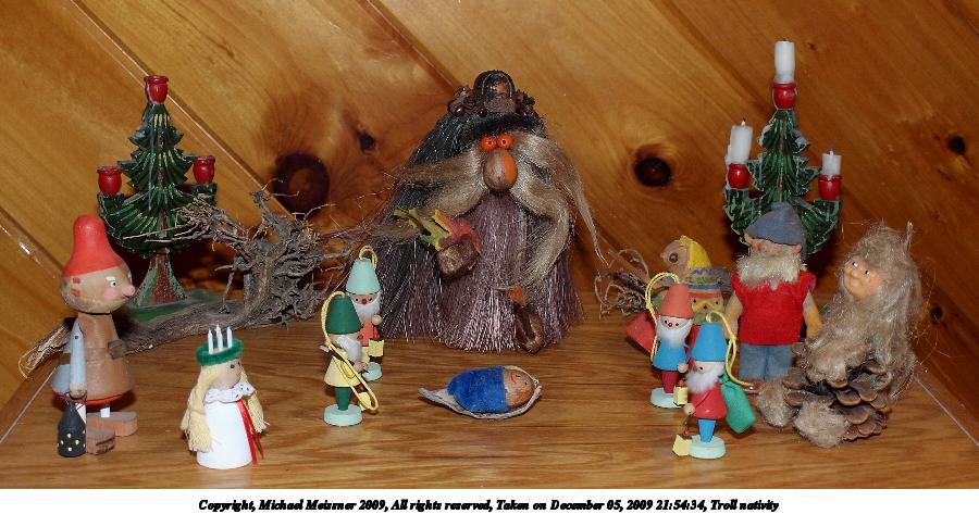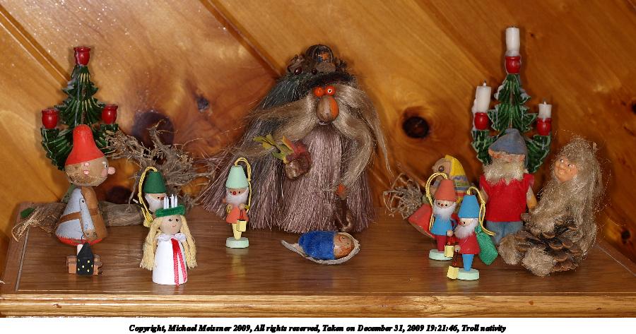 Picture #3: Troll nativity 900x473, 102,043 bytes (100K), (html file) Copyright, Michael Meissner 2009, All rights reserved Olympus E-P2 camera with Olympus 14-42mm lens f/4.8, ISO 200, FL-36 flash, 1/60 sec, 26.0mm, auto mode, natural color, matrix metering, IS1 (All Direction Shake IS), noise reduction auto 35mm equivalent focal length 52.0mm Extra equipment used: FL-36 flash Programs used: gimp Taken by Michael Meissner on December 05, 2009 21:54:34 Last modified on December 06, 2009 at 09:40 |