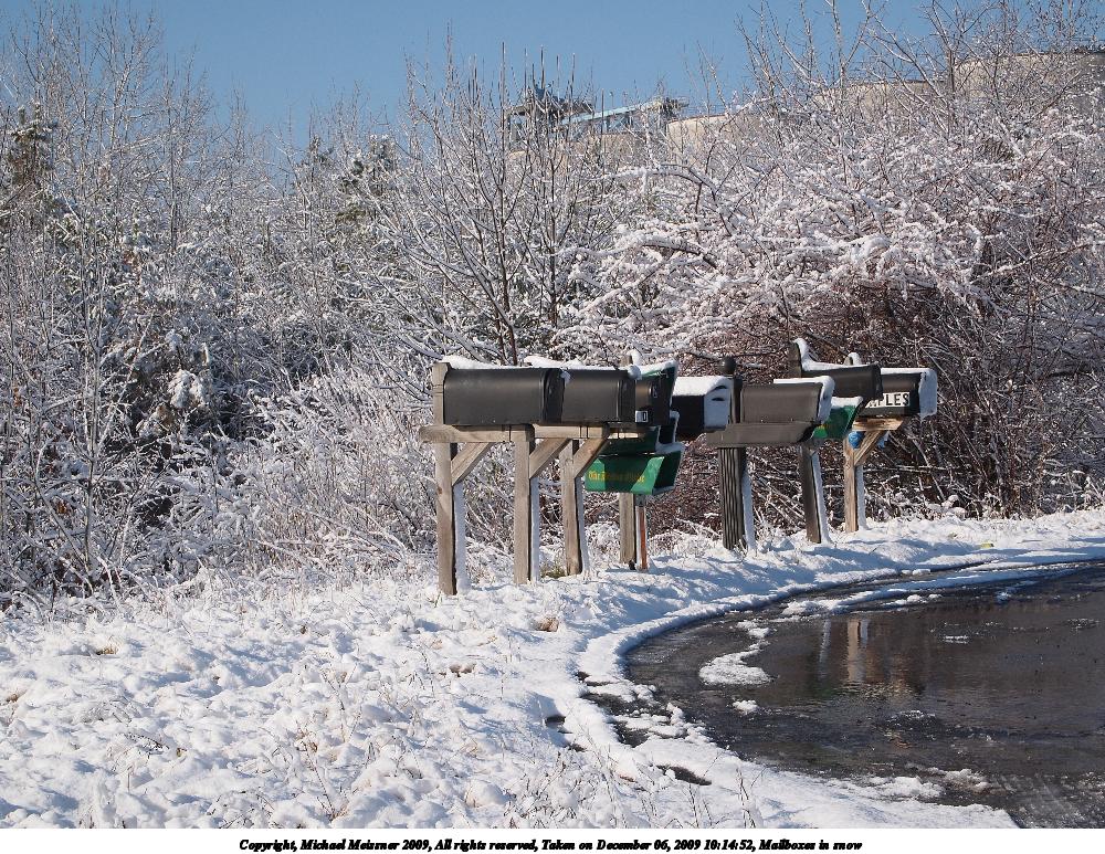 Picture #3: Mailboxes in snow 1000x773, 287,708 bytes (281K), (html file) Copyright, Michael Meissner 2009, All rights reserved Olympus E-P2 camera with Olympus-m43 14-42mm f/3.5-5.6 lens f/11.0, ISO 200, 1/400 sec, 42.0mm, auto mode, natural color, matrix metering, IS1 (All Direction Shake IS), noise reduction auto 35mm equivalent focal length 84.0mm Programs used: gimp Taken by Michael Meissner on December 06, 2009 10:14:52 Last modified on December 06, 2009 at 17:30 |