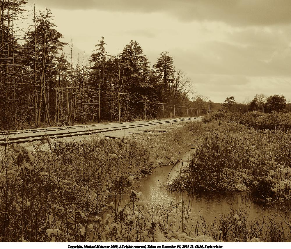 Picture #6: Sepia winter 1000x856, 274,919 bytes (269K), (html file) Copyright, Michael Meissner 2009, All rights reserved Olympus E-P2 camera with Olympus-m43 14-42mm f/3.5-5.6 lens f/9.0, ISO 200, 1/250 sec, 28.0mm, auto mode, natural color, fine weather (5300K), matrix metering, bias 0.3, IS1 (All Direction Shake IS), noise reduction auto 35mm equivalent focal length 56.0mm Programs used: gimp Taken by Michael Meissner on December 06, 2009 13:45:36 Last modified on December 06, 2009 at 17:43 |