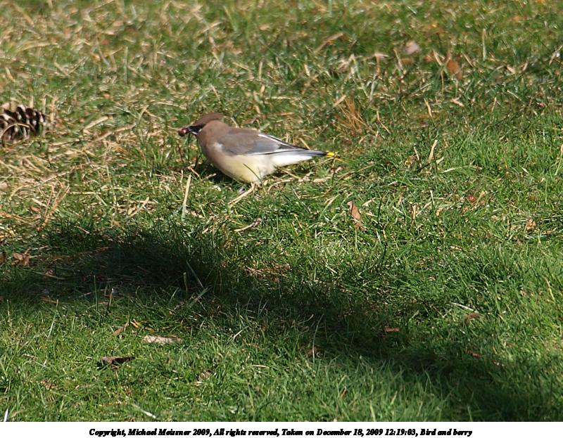 Picture #1: Bird and berry 800x623, 159,319 bytes (156K), (html file) Copyright, Michael Meissner 2009, All rights reserved Olympus E-3 camera with Olympus 40-150mm f/4.0-5.6 lens f/5.6, ISO 100, 1/320 sec, 150.0mm, auto mode, natural color, matrix metering, IS1 (All Direction Shake IS) 35mm equivalent focal length 301.0mm Programs used: gimp Taken by Michael Meissner on December 18, 2009 12:19:03 Last modified on December 18, 2009 at 22:16 |