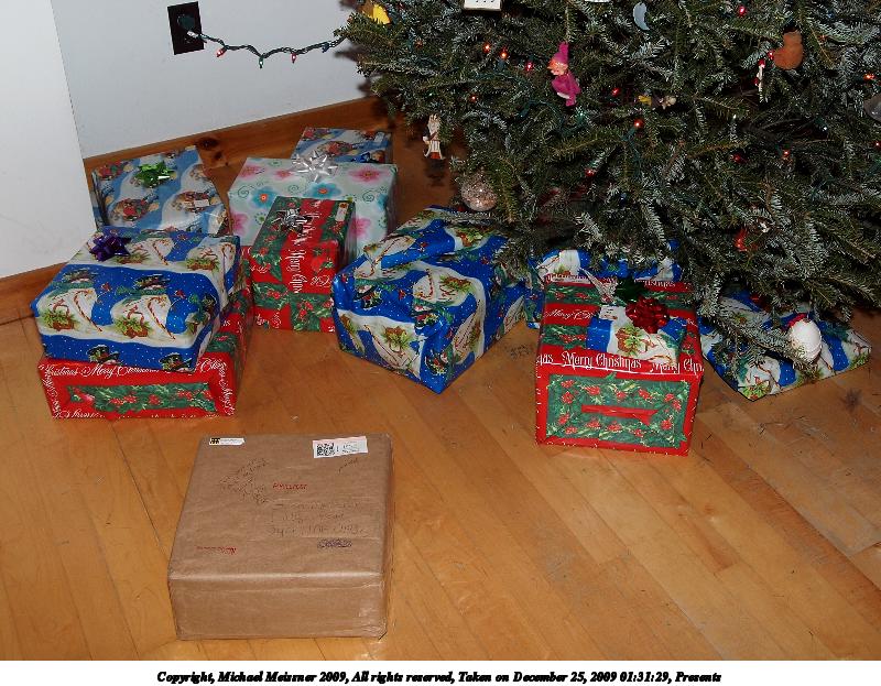 Picture #7: Presents 800x623, 134,602 bytes (132K), (html file) Copyright, Michael Meissner 2009, All rights reserved Olympus E-P2 camera with Olympus-m43 14-42mm f/3.5-5.6 lens f/3.9, ISO 200, FL-36 flash, 1/60 sec, 18.0mm, auto mode, natural color, matrix metering, IS1 (All Direction Shake IS), noise reduction auto 35mm equivalent focal length 36.0mm Extra equipment used: FL-36 flash Programs used: gimp Taken by Michael Meissner on December 25, 2009 01:31:29 Last modified on December 31, 2009 at 20:27 |