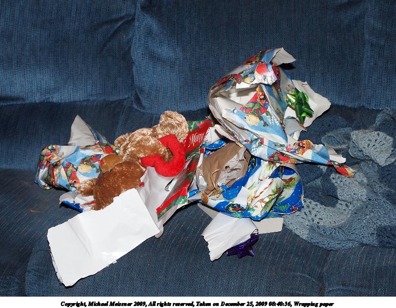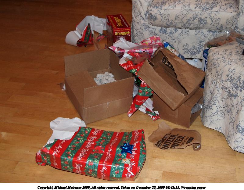 Picture #14: Wrapping paper #3 800x623, 106,670 bytes (105K), (html file) Copyright, Michael Meissner 2009, All rights reserved Olympus E-P2 camera with Olympus-m43 14-42mm f/3.5-5.6 lens f/4.4, ISO 200, FL-36 flash, 1/60 sec, 24.0mm, auto mode, natural color, matrix metering, IS1 (All Direction Shake IS), noise reduction auto 35mm equivalent focal length 48.0mm Extra equipment used: FL-36 flash Programs used: gimp Taken by Michael Meissner on December 25, 2009 08:41:20 Last modified on December 31, 2009 at 21:01 |