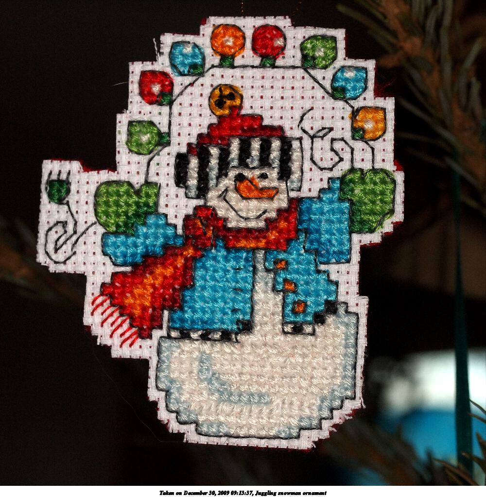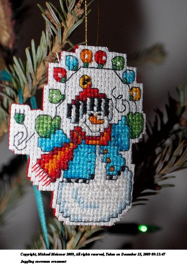 Picture #17: Juggling snowman ornament 600x846, 120,689 bytes (118K), (html file) Copyright, Michael Meissner 2009, All rights reserved Olympus E-P2 camera with Olympus-m43 14-42mm f/3.5-5.6 lens f/5.6, ISO 200, FL-36 flash, 1/80 sec, 42.0mm, auto mode, natural color, matrix metering, IS1 (All Direction Shake IS), noise reduction auto 35mm equivalent focal length 84.0mm Extra equipment used: FL-36 flash Programs used: gimp Taken by Michael Meissner on December 25, 2009 09:11:47 Last modified on December 31, 2009 at 23:48 |