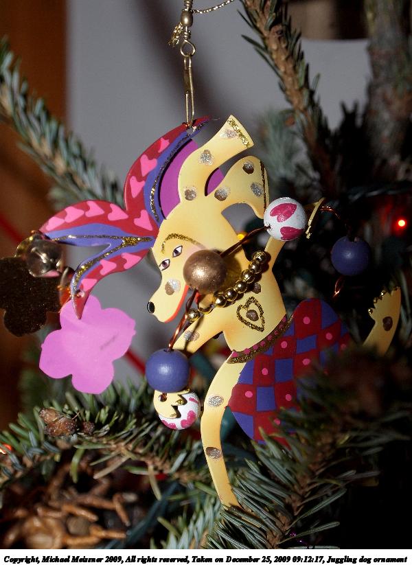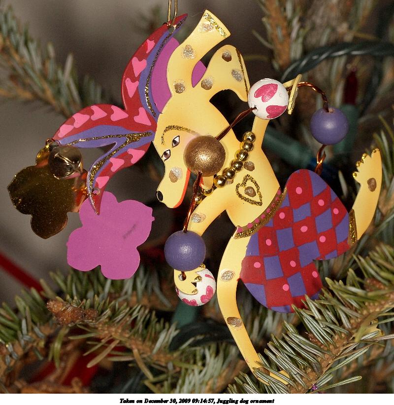 Picture #19: Juggling dog ornament 600x823, 94,140 bytes (92K), (html file) Copyright, Michael Meissner 2009, All rights reserved Olympus E-P2 camera with Olympus-m43 14-42mm f/3.5-5.6 lens f/5.2, ISO 200, FL-36 flash, 1/60 sec, 35.0mm, auto mode, natural color, matrix metering, IS1 (All Direction Shake IS), noise reduction auto 35mm equivalent focal length 70.0mm Extra equipment used: FL-36 flash Programs used: gimp Taken by Michael Meissner on December 25, 2009 09:12:17 Last modified on December 31, 2009 at 23:53 |