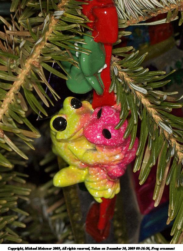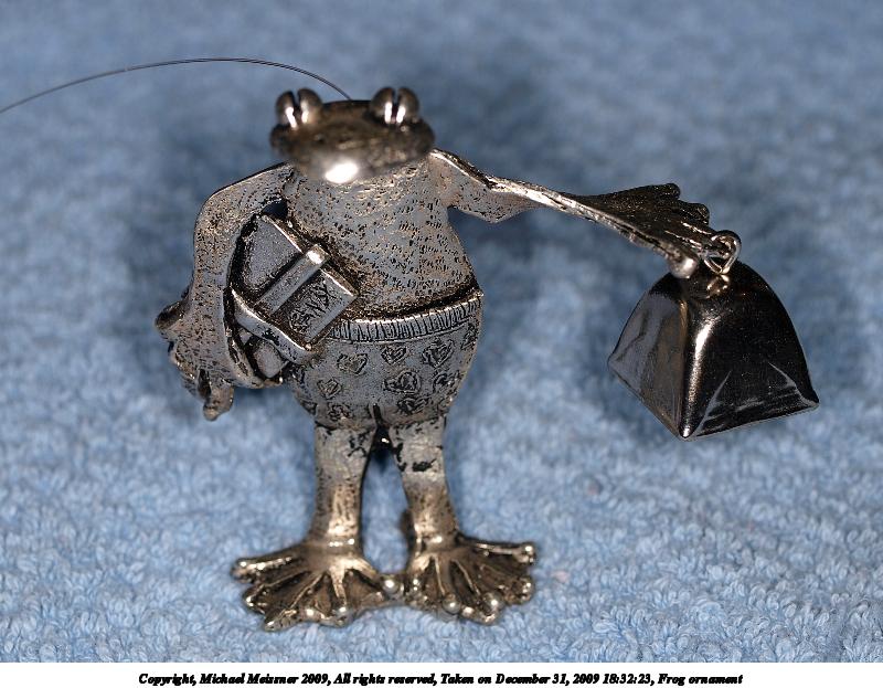 Picture #33: Frog ornament 600x823, 117,743 bytes (115K), (html file) Copyright, Michael Meissner 2009, All rights reserved Olympus E-P2 camera with Olympus 50mm f/2.0 lens f/8.0, ISO 200, Promaster flash, 1/100 sec, 50.0mm, aperture priority, natural color, fine weather with shade (7500K), matrix metering, IS1 (All Direction Shake IS), noise reduction auto 35mm equivalent focal length 100.0mm Extra equipment used: Promaster ring flash Programs used: gimp Taken by Michael Meissner on December 30, 2009 09:16:56 Last modified on January 01, 2010 at 00:50 |