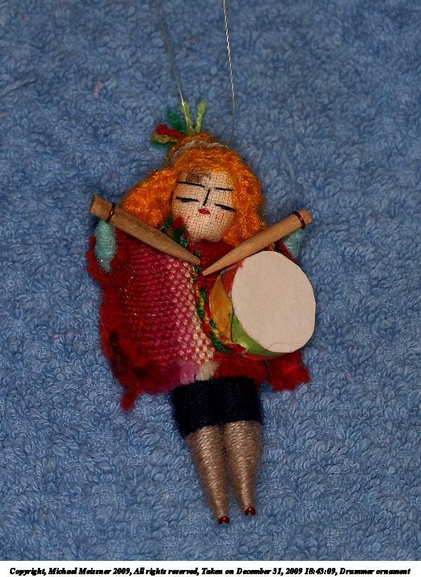 Picture #45: Drummer ornament 600x823, 116,927 bytes (115K), (html file) Copyright, Michael Meissner 2009, All rights reserved Olympus E-3 camera with Olympus 50mm f/2.0 lens f/5.6, ISO 100, Promaster flash, 1/100 sec, 50.0mm, aperture priority, natural color, matrix metering, IS1 (All Direction Shake IS) 35mm equivalent focal length 100.0mm Extra equipment used: Promaster ring flash Programs used: gimp Taken by Michael Meissner on December 31, 2009 18:43:09 Last modified on January 01, 2010 at 20:29 |