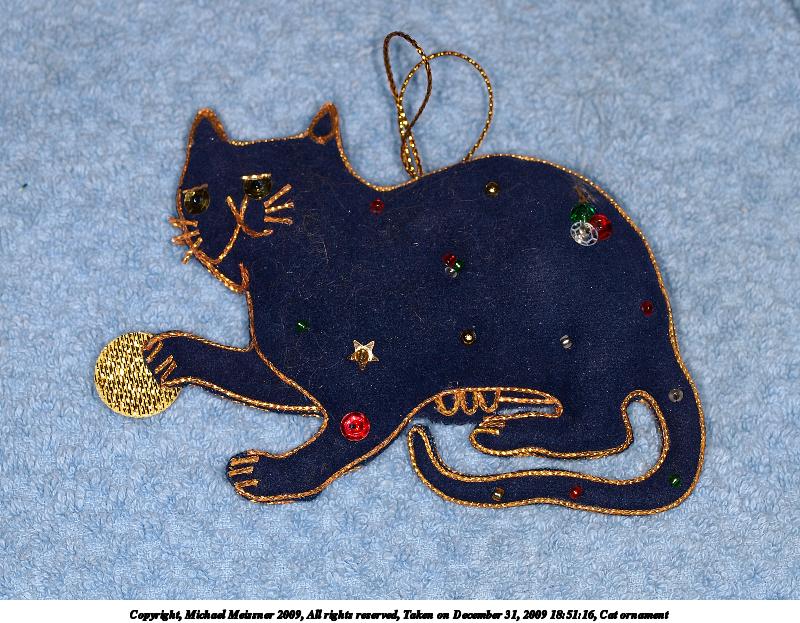 Picture #50: Cat ornament #3 600x823, 126,759 bytes (124K), (html file) Copyright, Michael Meissner 2009, All rights reserved Olympus E-3 camera with Olympus 50mm f/2.0 lens f/5.6, ISO 100, Promaster flash, 1/100 sec, 50.0mm, aperture priority, natural color, matrix metering, IS1 (All Direction Shake IS) 35mm equivalent focal length 100.0mm Extra equipment used: Promaster ring flash Programs used: gimp Taken by Michael Meissner on December 31, 2009 18:49:07 Last modified on January 01, 2010 at 20:38 |