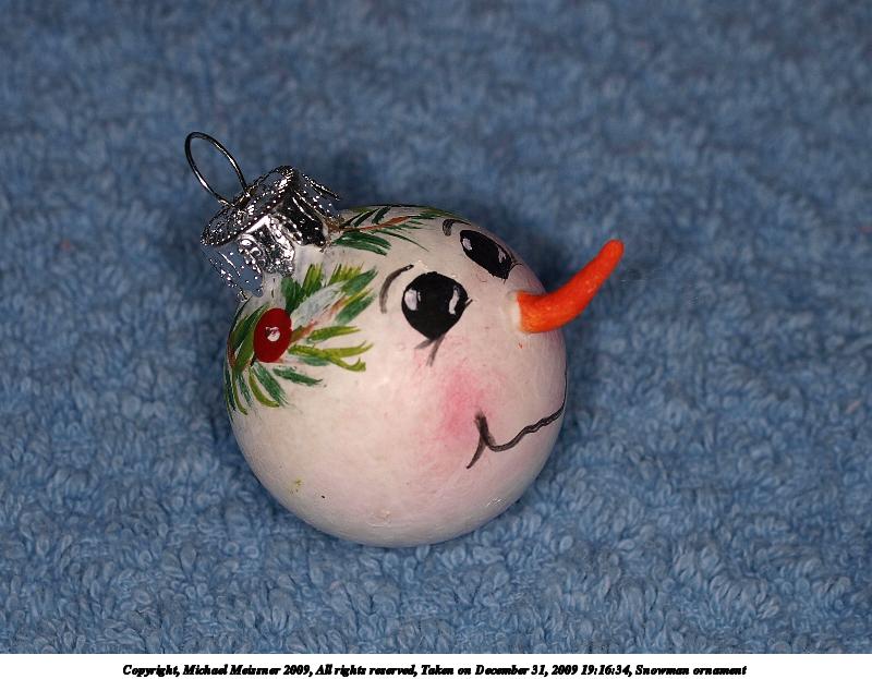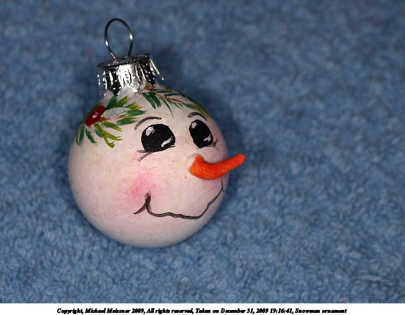Picture #57: Snowman ornament #2 800x623, 70,748 bytes (70K), (html file) Copyright, Michael Meissner 2009, All rights reserved Olympus E-3 camera with Olympus 50mm f/2.0 lens f/5.6, ISO 100, Promaster flash, 1/100 sec, 50.0mm, aperture priority, natural color, matrix metering, IS1 (All Direction Shake IS) 35mm equivalent focal length 100.0mm Extra equipment used: Promaster ring flash Programs used: gimp Taken by Michael Meissner on December 31, 2009 19:16:41 Last modified on January 01, 2010 at 20:53 |