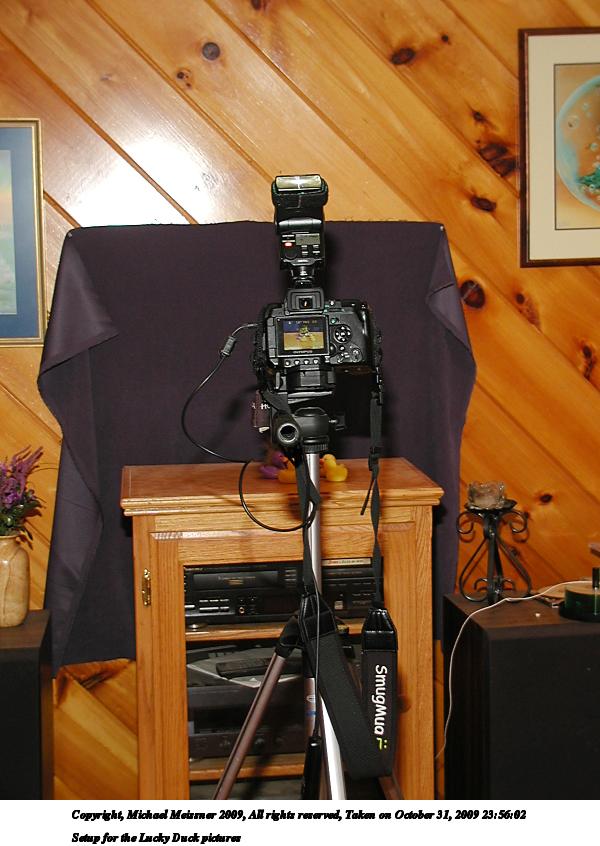 Picture #19: Setup for the Lucky Duck pictures 600x846, 78,313 bytes (77K), (html file) Copyright, Michael Meissner 2009, All rights reserved Olympus C-2100UZ camera f/2.8, ISO 100, 1/50 sec, 12.3mm, auto mode, SHQ, cloudy, matrix metering 35mm equivalent focal length 68.0mm Extra equipment used: Promaster 5750DX flash Programs used: gimp Taken by Michael Meissner on October 31, 2009 23:56:02 Last modified on November 01, 2009 at 13:03 |