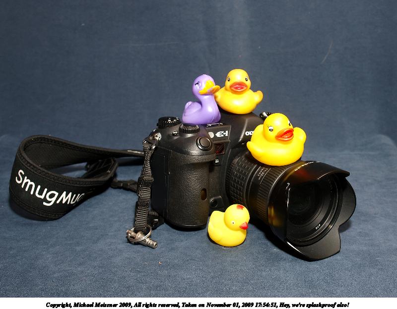 Picture #15: Hey, we're splashproof also! 800x623, 86,899 bytes (85K), (html file) Copyright, Michael Meissner 2009, All rights reserved Olympus E-3 camera with Olympus 14-54mm f/2.8-3.5 lens f/5.6, ISO 100, FL-36 flash, 1/60 sec, 23.0mm, aperture priority, natural color, matrix metering, IS1 (All Direction Shake IS) 35mm equivalent focal length 46.0mm Extra equipment used: FL-36, Flip-it Programs used: gimp Taken by Michael Meissner on November 01, 2009 17:54:51 Last modified on November 01, 2009 at 18:43 |