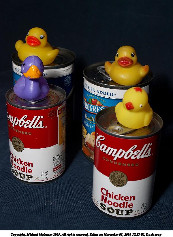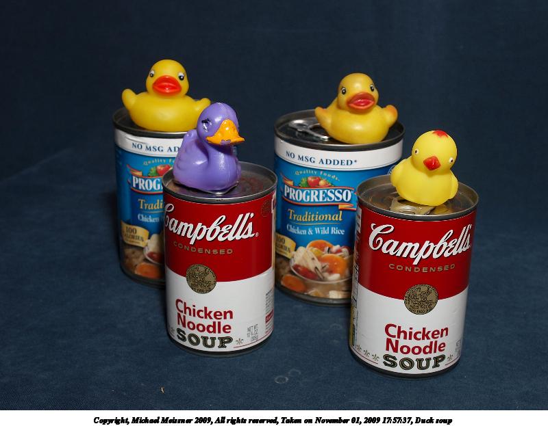 Picture #14: Duck soup 800x623, 77,231 bytes (76K), (html file) Copyright, Michael Meissner 2009, All rights reserved Olympus E-3 camera with Olympus 14-54mm f/2.8-3.5 lens f/5.6, ISO 100, FL-36 flash, 1/60 sec, 25.0mm, aperture priority, natural color, matrix metering, IS1 (All Direction Shake IS) 35mm equivalent focal length 50.0mm Extra equipment used: FL-36, Flip-it Programs used: gimp Taken by Michael Meissner on November 01, 2009 17:57:37 Last modified on November 01, 2009 at 18:45 |
