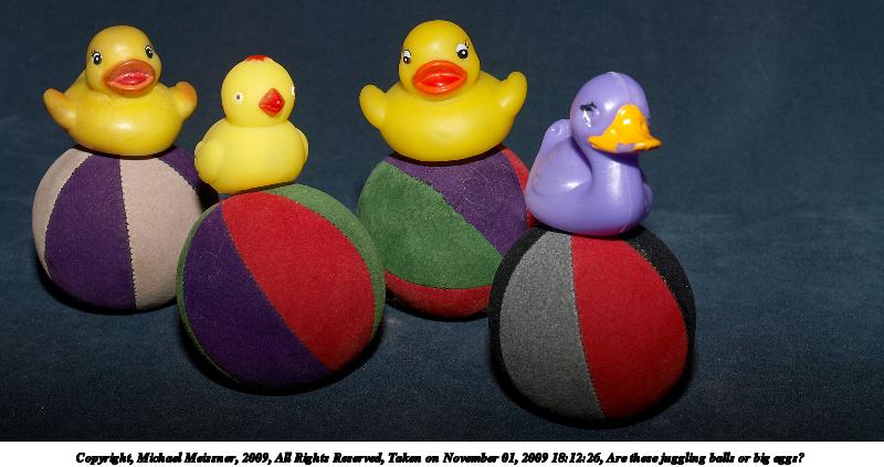 Picture #7: Are these juggling balls or big eggs? 800x423, 60,506 bytes (60K), (html file) Copyright, Michael Meissner, 2009, All Rights Reserved Olympus E-3 camera with Olympus 14-54mm f/2.8-3.5 lens f/5.6, ISO 100, FL-36 flash, 1/60 sec, 28.0mm, aperture priority, natural color, matrix metering, IS1 (All Direction Shake IS) 35mm equivalent focal length 56.0mm Extra equipment used: FL-36 Programs used: gimp Taken by Michael Meissner on November 01, 2009 18:12:26 Last modified on November 01, 2009 at 19:15 |