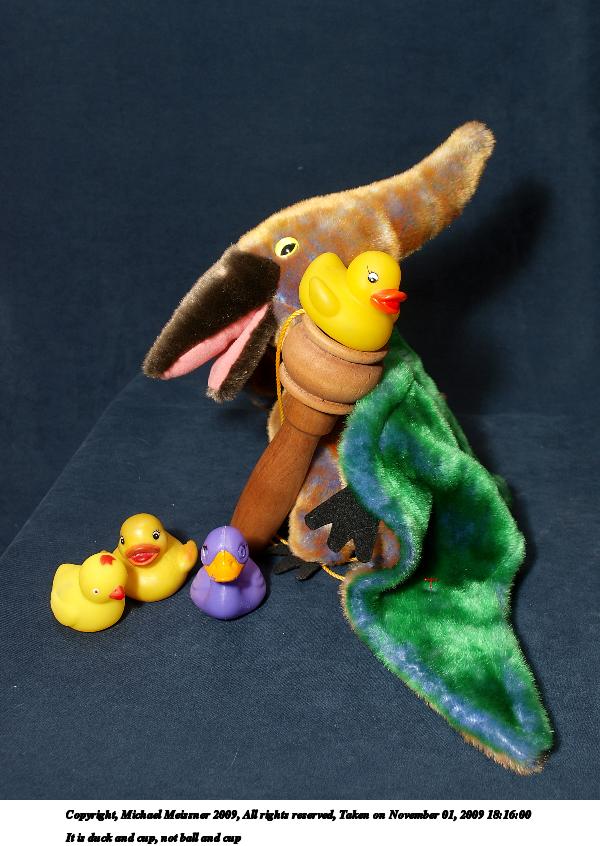 Picture #5: It is duck and cup, not ball and cup 600x846, 83,999 bytes (83K), (html file) Copyright, Michael Meissner 2009, All rights reserved Olympus E-3 camera with Olympus 14-54mm f/2.8-3.5 lens f/5.6, ISO 100, FL-36 flash, 1/60 sec, 19.0mm, aperture priority, natural color, matrix metering, IS1 (All Direction Shake IS) 35mm equivalent focal length 38.0mm Extra equipment used: FL-36, Flip-it Programs used: gimp Taken by Michael Meissner on November 01, 2009 18:16:00 Last modified on November 01, 2009 at 19:06 |
