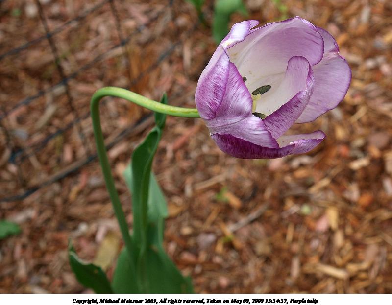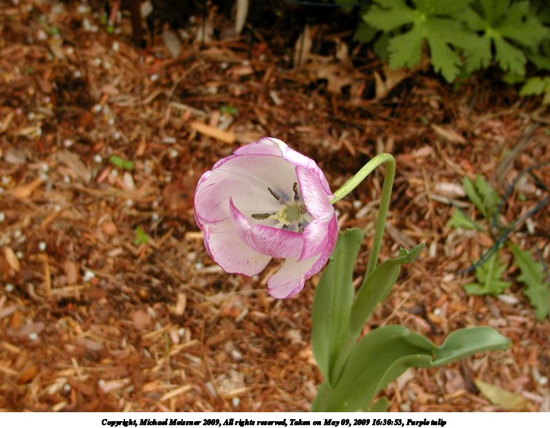 Picture #22: Purple tulip #3 Thumb: 400x300, 39,784 bytes (39K) Small: 800x623, 82,039 bytes (81K), (html file) Copyright, Michael Meissner 2009, All rights reserved Olympus C-2100UZ camera f/2.8, ISO 100, 1/250 sec, 13.8mm, auto mode, SHQ, cloudy, matrix metering, macro 35mm equivalent focal length 77.0mm Programs used: gimp Taken by Michael Meissner on May 09, 2009 16:30:53 Last modified on July 27, 2009 at 08:36 Shutter speed of 1/125 or 1/250 may indicate use of flash |