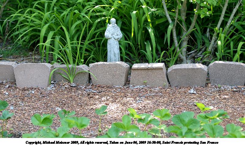 Picture #63: Saint Francis protecting San Franso Thumb: 400x225, 66,016 bytes (65K) Small: 800x473, 161,836 bytes (159K), (html file) Copyright, Michael Meissner 2009, All rights reserved Olympus E-3 camera with Olympus 50mm f/2.0 lens f/2.2, ISO 100, 1/100 sec, 50.0mm, shutter priority, natural color, center weight metering, IS1 (All Direction Shake IS) 35mm equivalent focal length 100.0mm Programs used: gimp Taken by Michael Meissner on June 06, 2009 16:50:08 Last modified on August 27, 2009 at 00:31 |