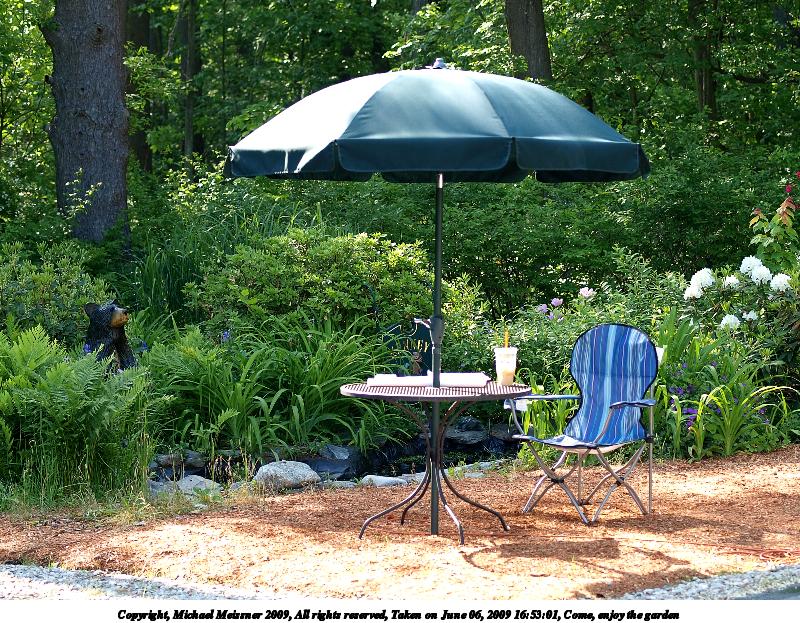 Picture #66: Come, enjoy the garden Thumb: 400x300, 78,093 bytes (77K) Small: 800x623, 212,877 bytes (208K), (html file) Copyright, Michael Meissner 2009, All rights reserved Olympus E-3 camera with Olympus 50mm f/2.0 lens f/2.5, ISO 100, 1/200 sec, 50.0mm, auto mode, natural color, center weight metering, IS1 (All Direction Shake IS) 35mm equivalent focal length 100.0mm Programs used: gimp Taken by Michael Meissner on June 06, 2009 16:53:01 Last modified on August 27, 2009 at 00:37 |