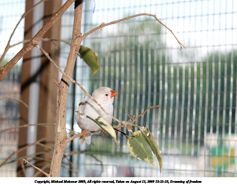 Picture #37: Dreaming of freedom #2 800x623, 89,132 bytes (88K), (html file) Copyright, Michael Meissner 2009, All rights reserved Olympus E-3 camera with Olympus 14-54mm f/2.8-3.5 lens f/4.5, ISO 100, flash, 1/200 sec, 52.0mm, auto mode, natural color, auto gradation, SHQ, matrix metering, IS1 (All Direction Shake IS), noise filter low 35mm equivalent focal length 104.0mm Extra equipment used: flash Programs used: gimp Taken by Michael Meissner on August 11, 2009 15:23:25 Last modified on October 17, 2009 at 11:25 |